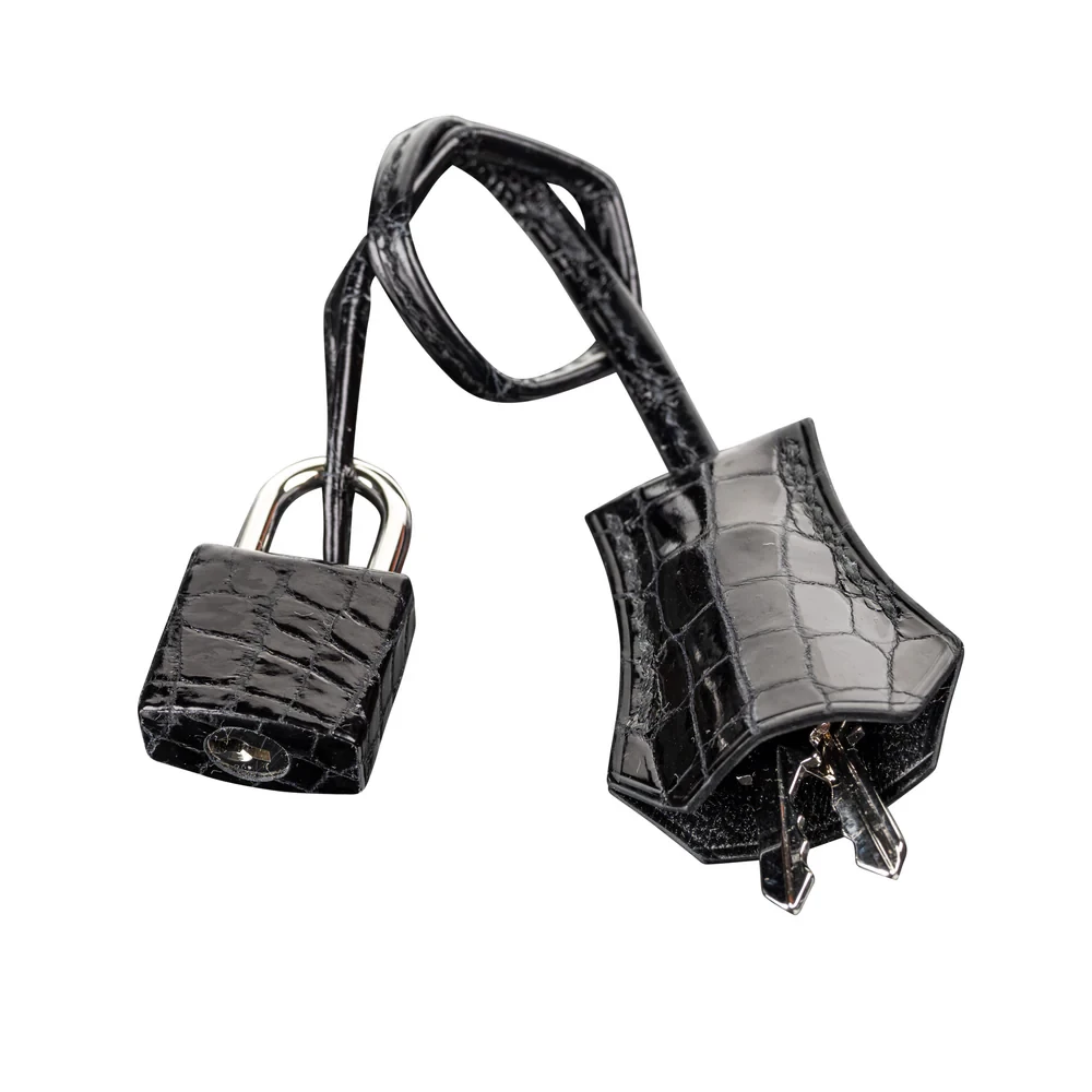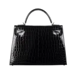 This Hermès inspired Kelly 32 features Black Shiny Niloticus crocodile leather for bold, glossy texture. Palladium hardware accents the slouchy retourne silhouette. The 32cm spacious design fits laptops, files, and travel gear. Niloticus crocodile is durable and weather resistant. Pair with leather jackets or evening gowns for edgy contrast. Built for travel, work, or luxury errands. Commanding sophistication.