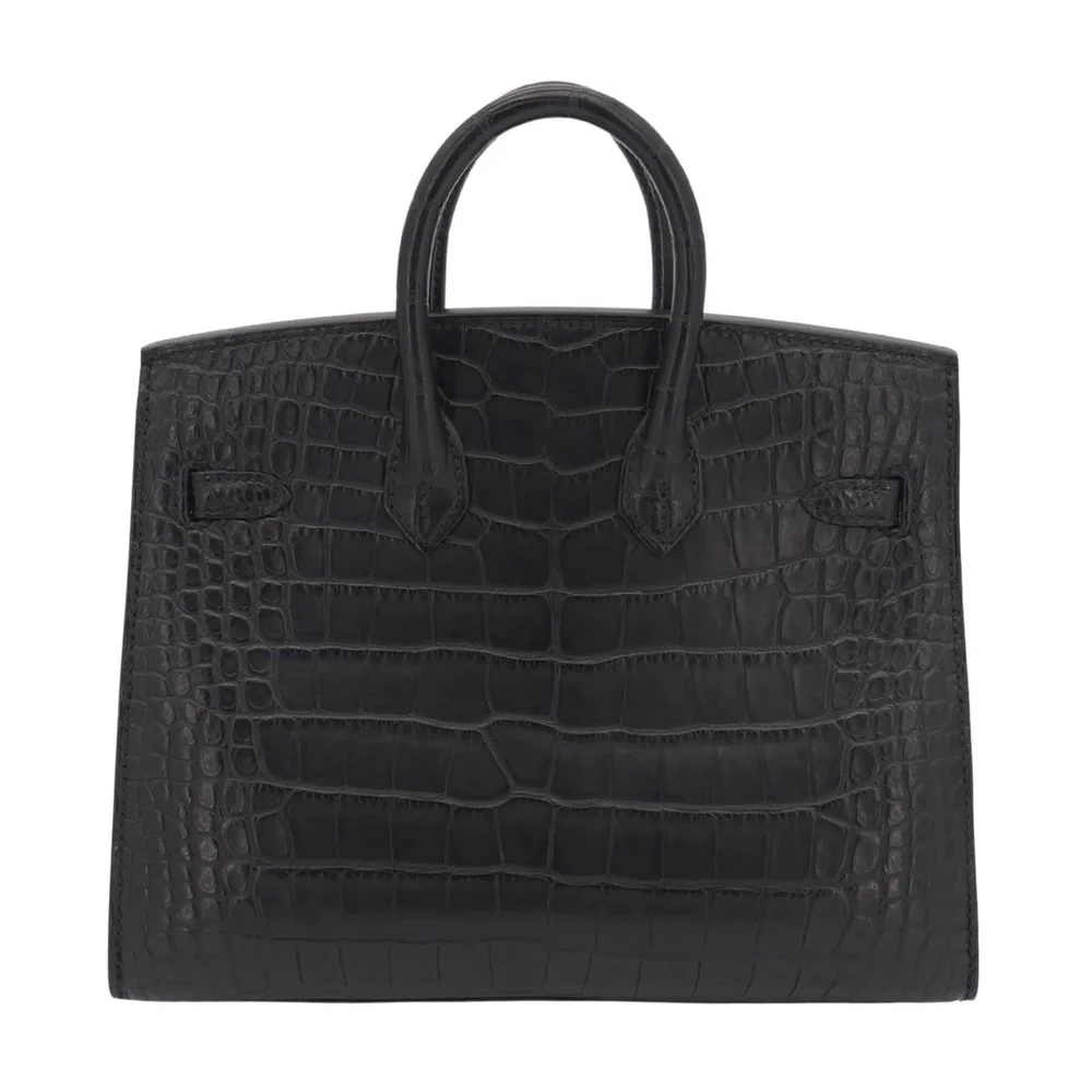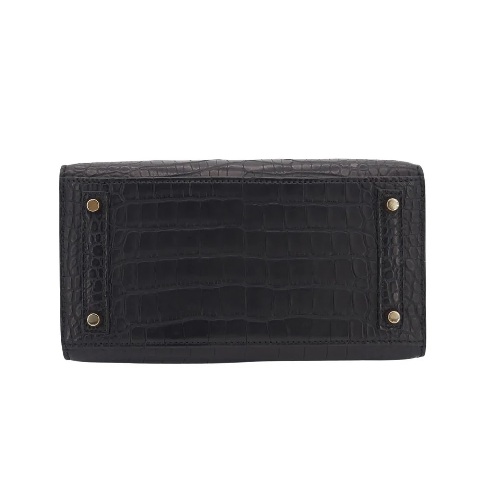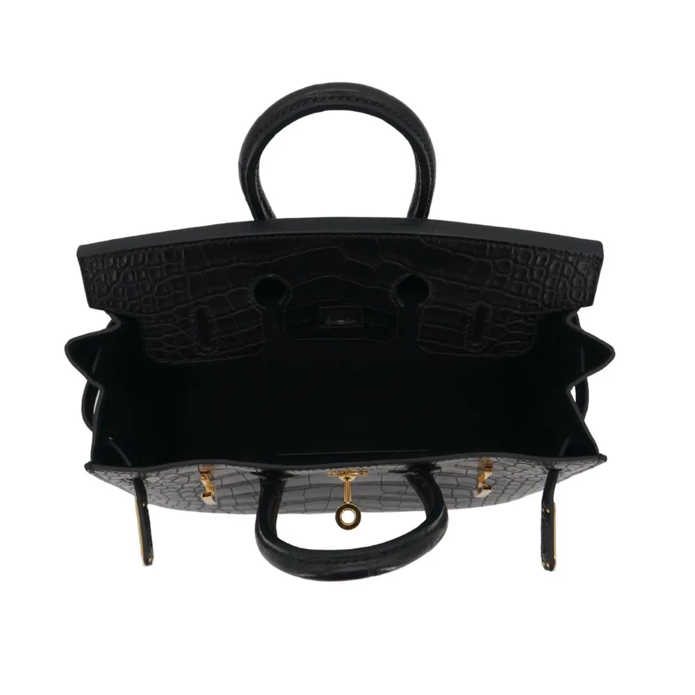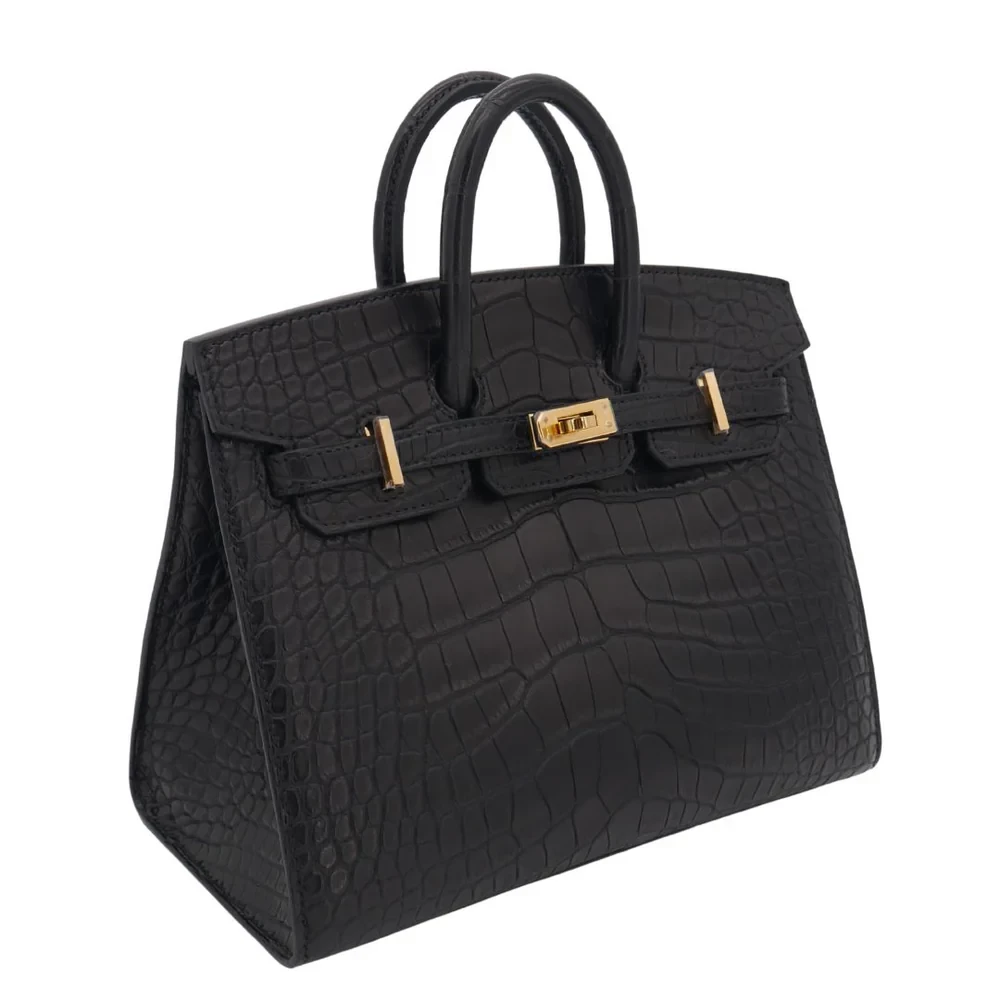 This Hermès style Birkin 20 Sellier features Black matte alligator leather for sleek minimalism. Gold hardware elevates the compact 20cm design. Matte alligator resists fingerprints and scratches. Fits essentials like cards and lipstick. Pair with monochrome outfits for stealthy elegance. Perfect for dinners or nights out. Petite luxury with edge.