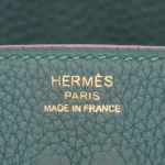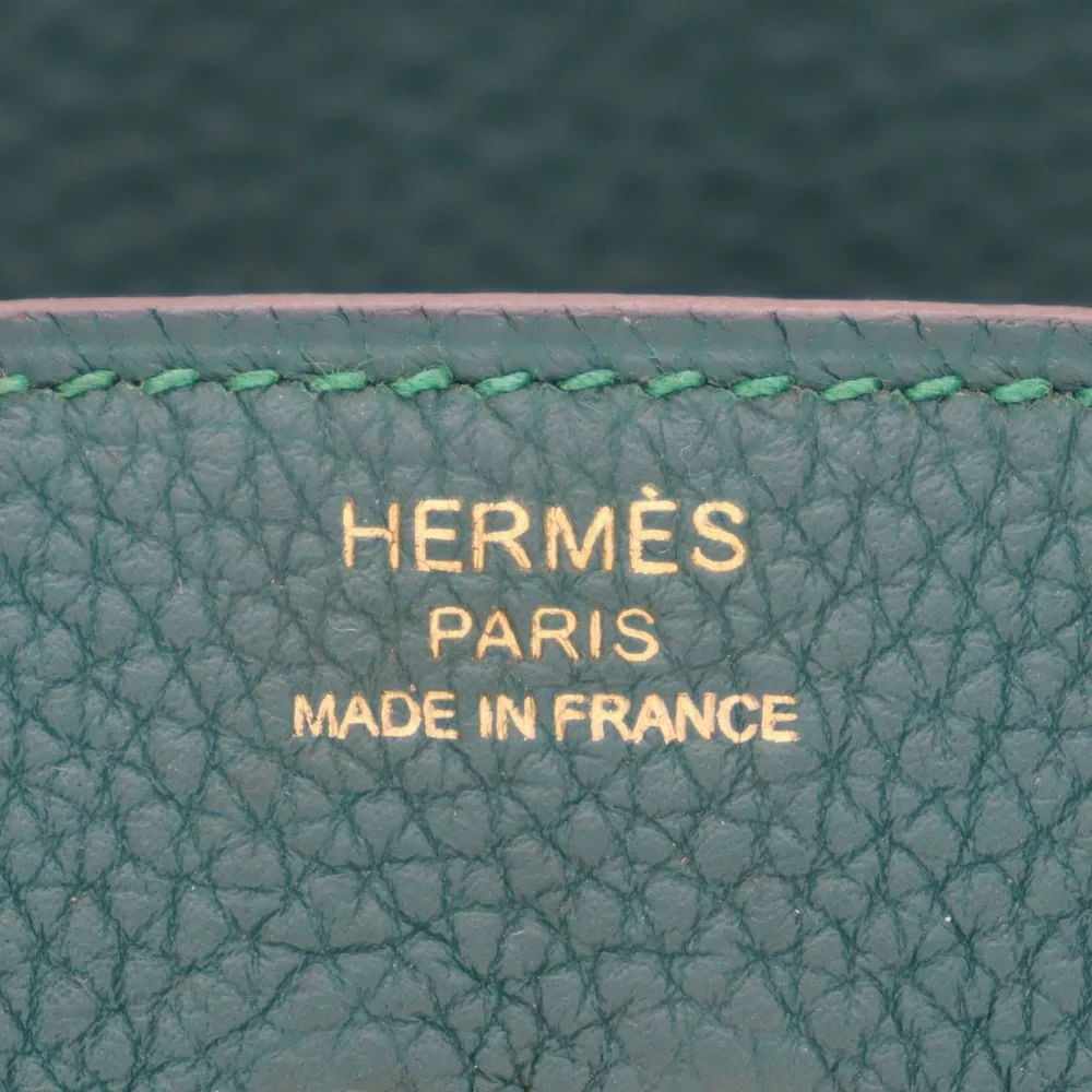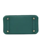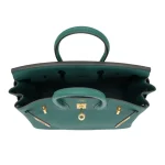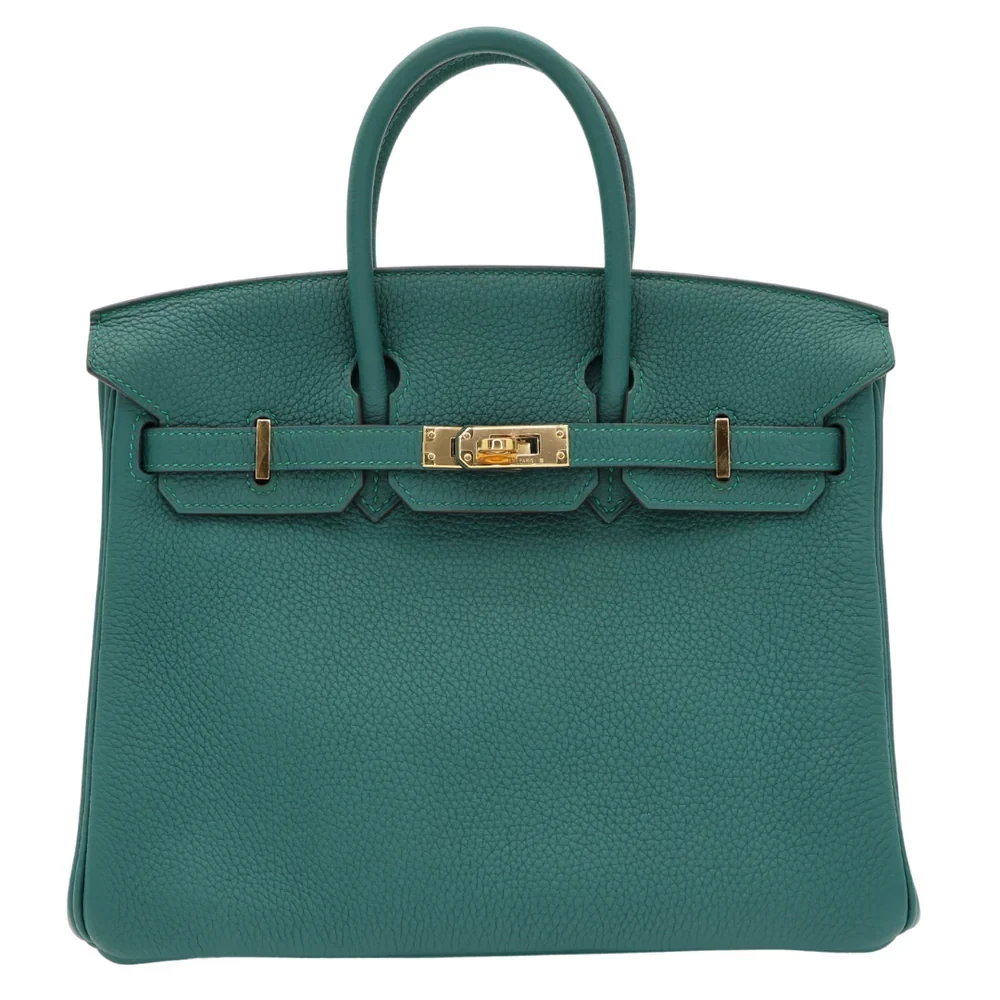 This Hermès style Birkin 25 glows in Malachite Togo leather, a deep emerald green shade. Gold hardware amplifies the jewel toned 25cm design. Scratch resistant Togo leather stays smooth for daily wear. Compact yet holds essentials like cards and keys. Pair with black or metallics for dramatic contrast. Lightweight and perfect for evenings out. A lush, nature inspired masterpiece.