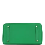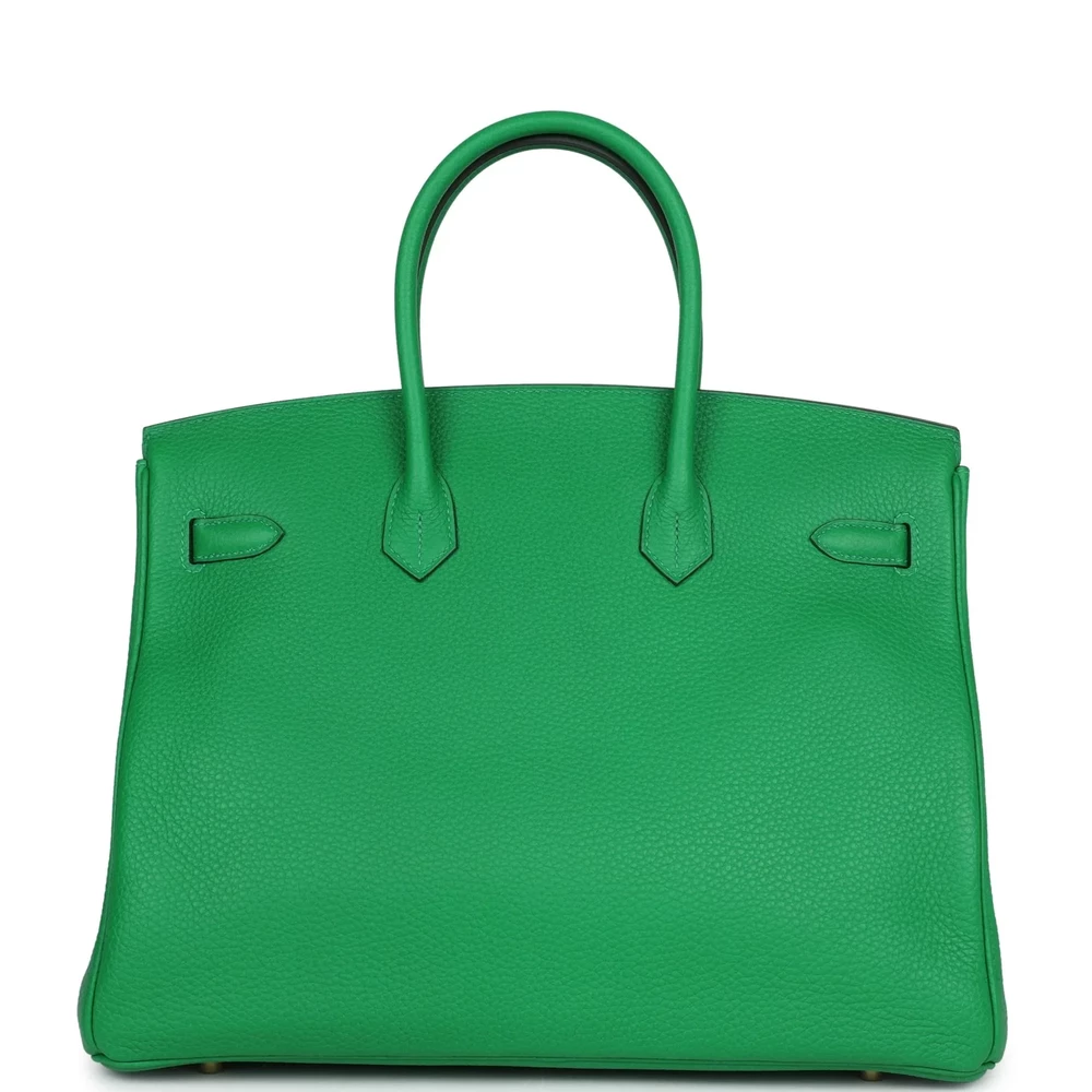 This Hermès inspired Birkin 35 boasts Bambou Clemence leather for a vibrant, grassy green hue. Gold hardware accents the relaxed, slouchy profile. The 35cm design carries books, tablets, and lunch boxes. Clemence leather resists scratches and softens over time. Pair with neutral tones or gold accessories for lively contrast. Fits parks, offices, or weekend markets. Fresh energy in every detail.