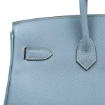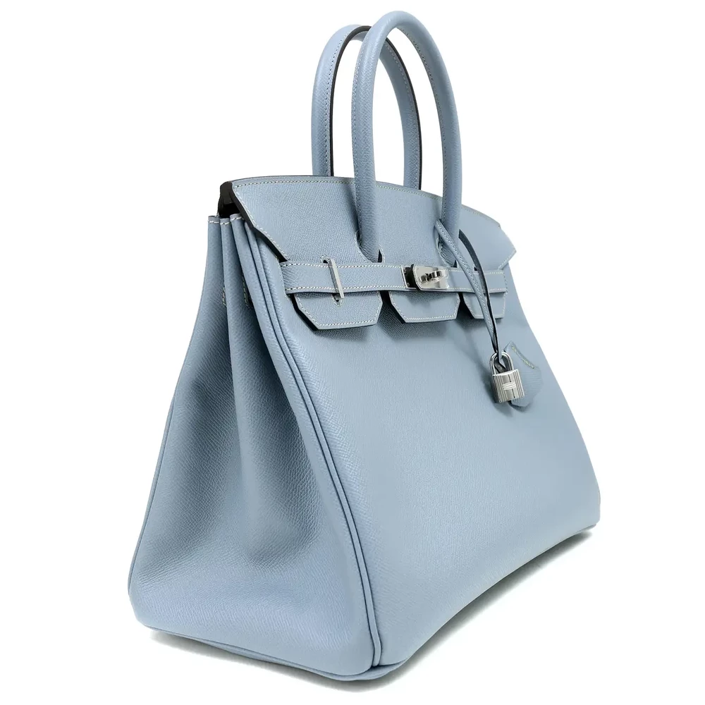 This Hermès Replica Birkin 35 features Bleu Lin Epsom leather. Palladium hardware keeps it fresh. The 35cm size organizes essentials. Epsom leather resists stains. Brightens professional looks. Your perfect spring companion. Soft luxury for everyday.