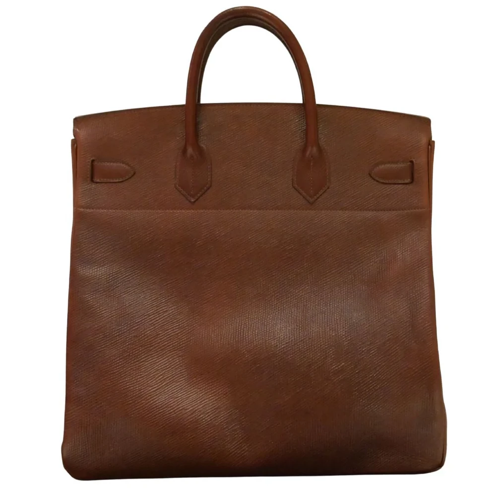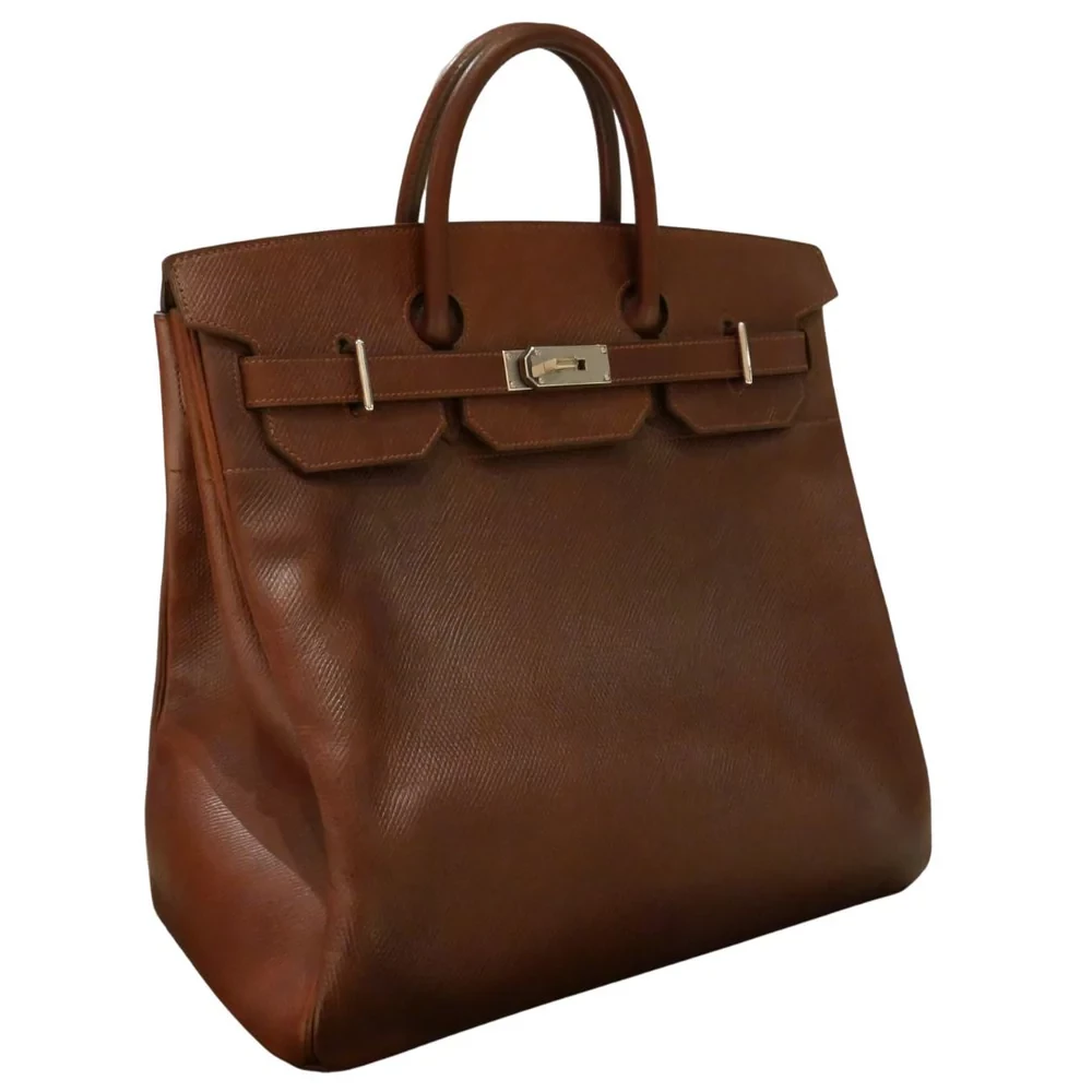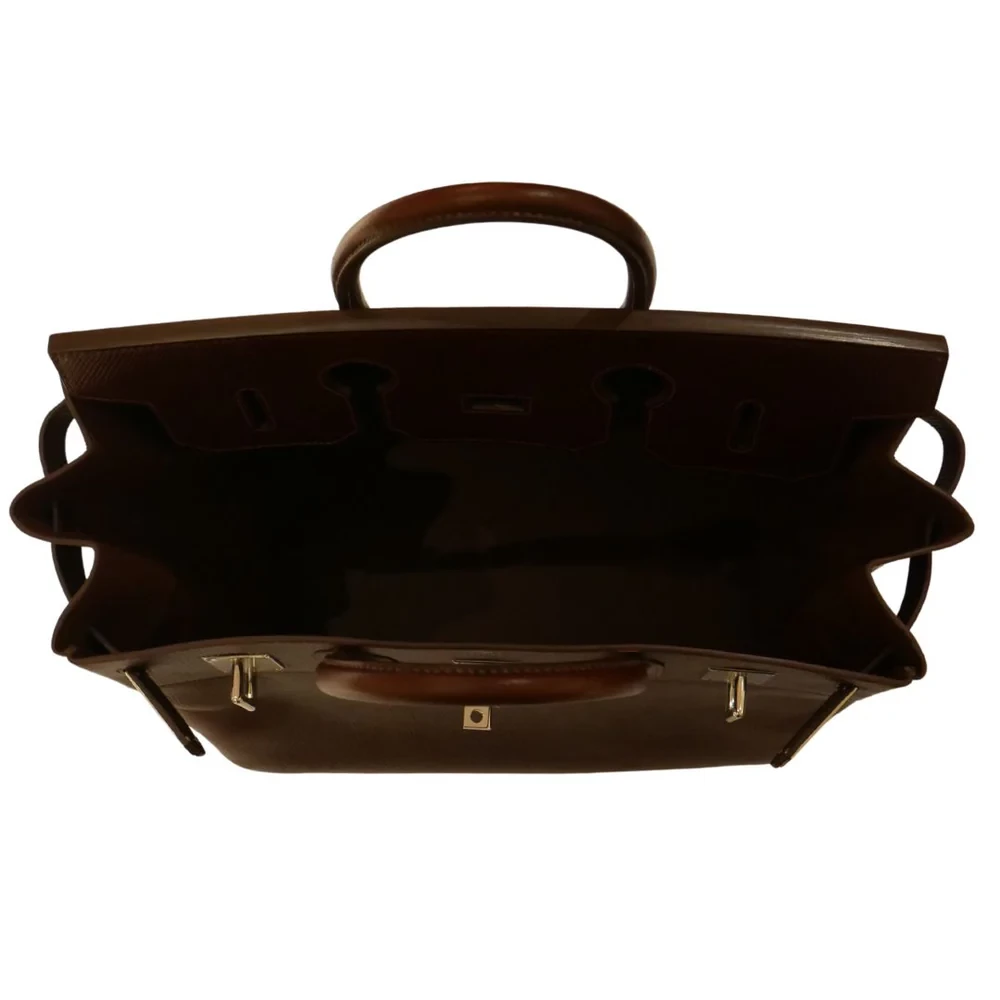 This Hermès style HAC 40 features Terre Volynka leather in earthy brown. Palladium hardware enhances the rustic texture. The 40cm design offers rugged functionality for daily use. Durable leather develops character over time. Perfect with neutral or autumnal outfits. Your companion for urban adventures. Raw luxury with soul.