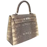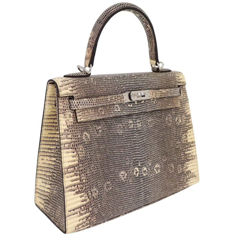 This Hermès inspired Kelly 25 Sellier features Ombre Lizard leather for gradient, sun kissed texture. Palladium hardware accents the crisp Sellier stitching and angular frame. The 25cm size fits tablets, planners, and essentials. Lizard leather is durable and subtly iridescent. Pair with neutrals or silk blouses for organic elegance. Built for luxury travel, events, or collector’s displays. Subtle shimmer, artisan crafted.