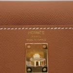 This Hermès style Kelly 25 shines in Gold Epsom leather. Matching gold hardware creates harmonious warmth. The 25cm sellier design stays structured and polished. Stain resistant surface stays pristine season after season. Pairs with earth tones or metallics for rich contrast. Perfect for weddings or holiday parties. Gilded luxury for golden moments.