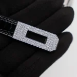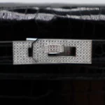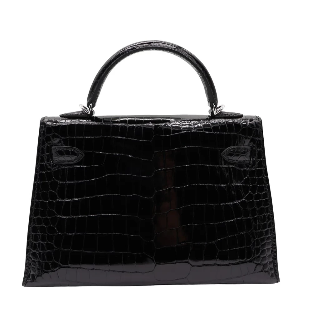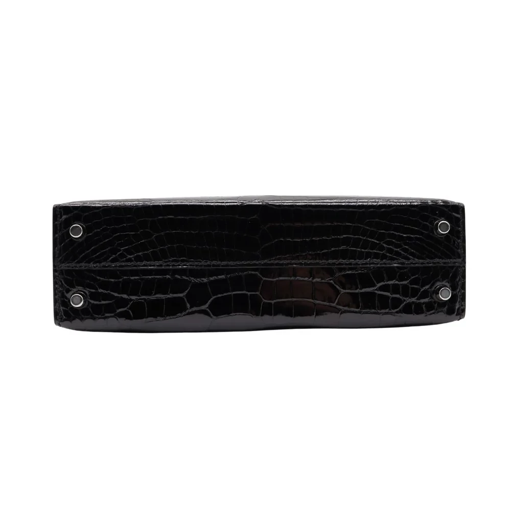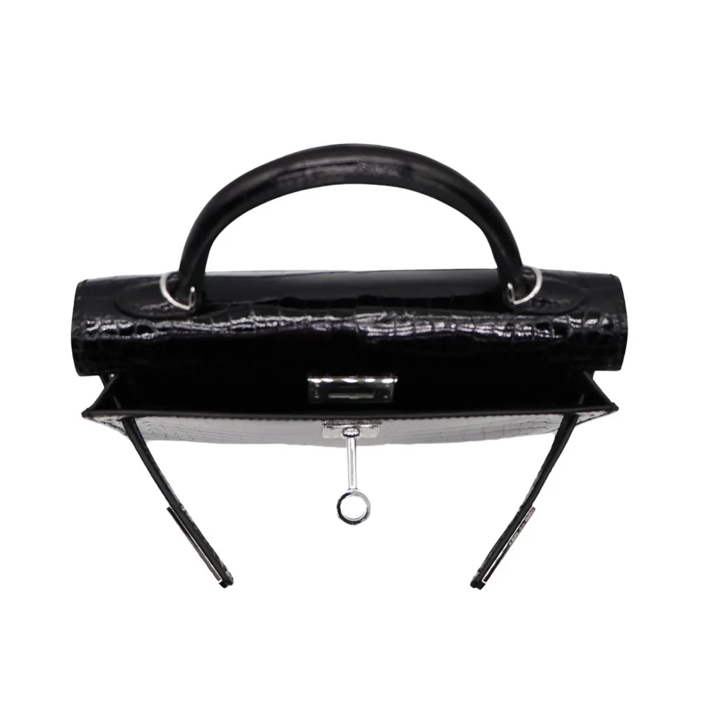 This Hermès style Kelly Mini features black crocodile. Diamond hardware adds red carpet sparkle. The 20cm sellier style contrasts opulence. Glossy leather wipes clean easily. Perfect for gala events. Concentrated luxury in petite form.