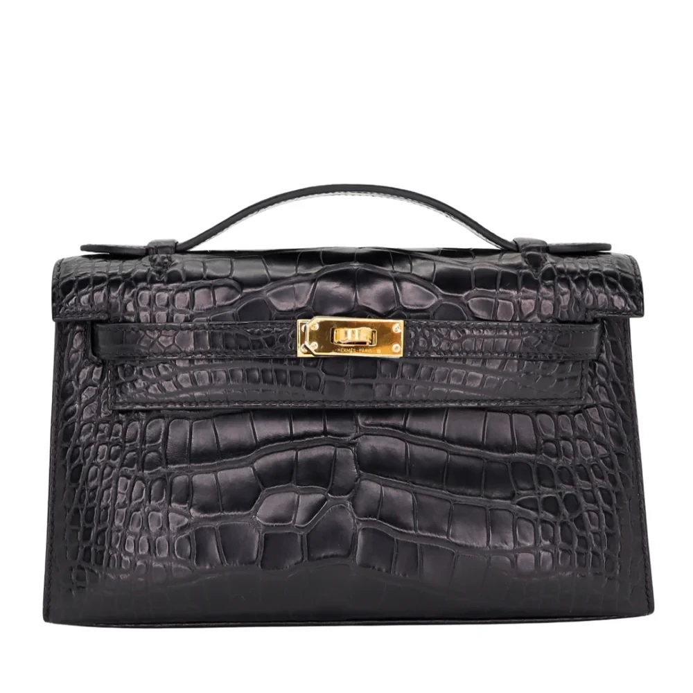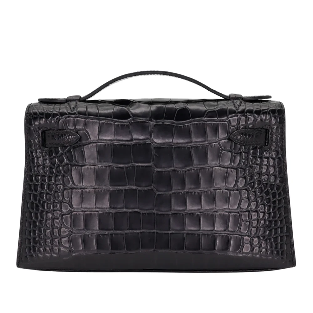 This Hermès Replica Kelly Pochette features black matte alligator. Gold hardware adds warm contrast. The pochette size fits evening essentials. Matte finish resists fingerprints. Elevates little black dresses. Your perfect night out companion. Stealth luxury for special occasions.