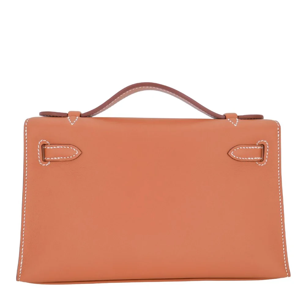 This Hermès inspired Kelly Pochette glows in Gold Swift leather for warm, sunlit elegance. Gold hardware complements the slim, structured silhouette. The pochette size fits lipsticks, cards, and small luxuries. Swift leather stays smooth and lightweight. Pair with neutrals or metallics for radiant contrast. Ideal for weddings, holidays, or daytime glamour. Gilded sophistication, perfected.