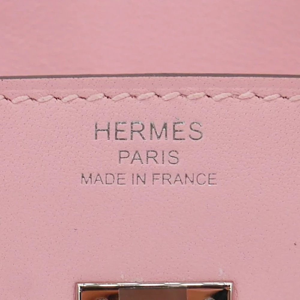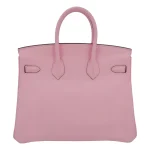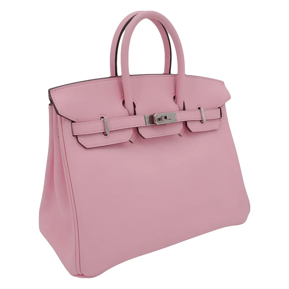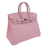 This Hermès style Birkin 25 glows in Rose Sakura Swift leather, a delicate petal pink shade. Palladium hardware adds cool contrast to the 25cm design. Buttery Swift leather resists scratches and feels luxurious. Compact yet fits essentials like a phone and lipstick. Pair with neutrals for romantic elegance. Perfect for weddings or brunches. Feminine grace redefined.