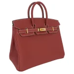 This Hermès Dupe Birkin 25 features warm Sienne Togo leather with natural grain. Gold hardware enhances the rich caramel tones. The 25cm size fits daily essentials comfortably. Togo leather develops beautiful patina over time. Perfect with earth tone outfits. Your perfect autumn wardrobe staple. Cozy luxury for everyday elegance.