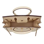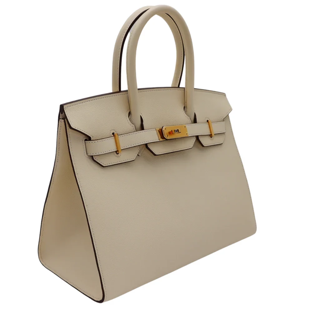 This Hermès style Birkin 30 in Nata uses creamy white Epsom leather. The gold hardware warms up the soft, neutral color. The 30cm Sellier design is crisp and polished for formal events. It holds your essentials while keeping a sleek silhouette. Pair it with pastels or bold colors for contrast. A bag that’s as elegant as a pearl necklace. Clean, chic, and totally timeless.
