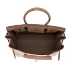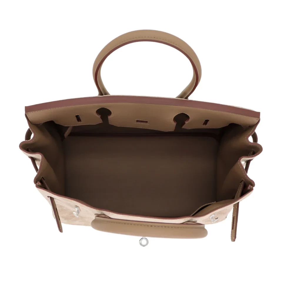 This Hermès inspired Birkin 30 mixes grey suede and Swift leather. The silver palladium hardware gives it a rugged, modern look. The 30cm size holds everything for work or weekends. The neutral tones hide dirt and wear. Perfect for autumn outfits or casual styles. A versatile bag for everyday adventures. Tough yet sophisticated.