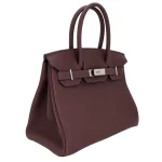 This Hermès inspired Birkin 30 dazzles in deep red Togo leather. The silver palladium hardware cools down the bold color. The 30cm size holds everything from laptops to gym gear. The rich red pairs with neutrals or black. Scratch resistant leather stays looking new. A fiery bag for confident trendsetters.