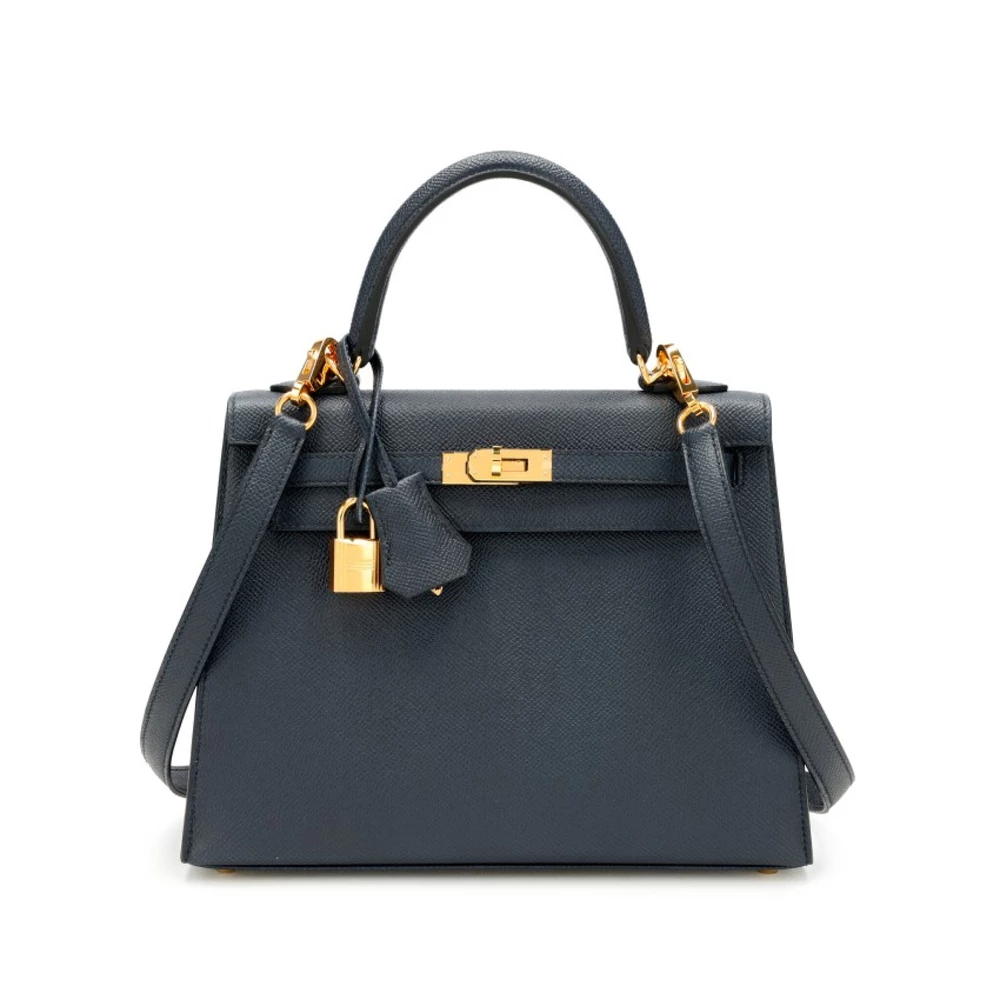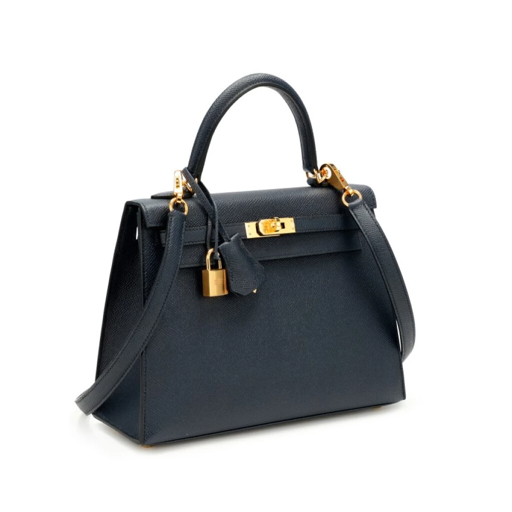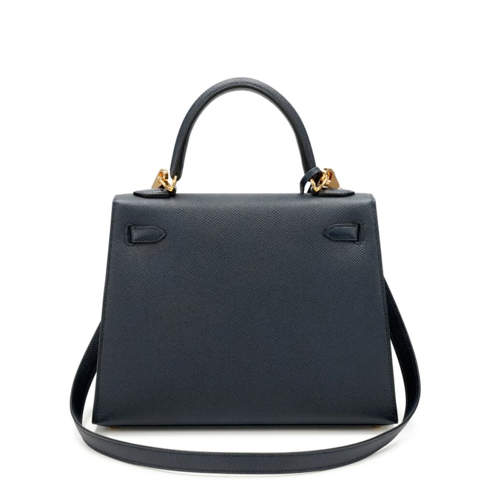 This Hermès style Kelly 25 features Bleu Indigo Epsom in deep navy. Gold hardware adds warmth to the cool tone. The sellier design organizes work essentials neatly. Durable leather resists scratches and stains. Pairs with neutrals or metallics effortlessly. Your perfect office to evening companion. Classic sophistication redefined.