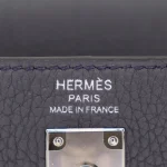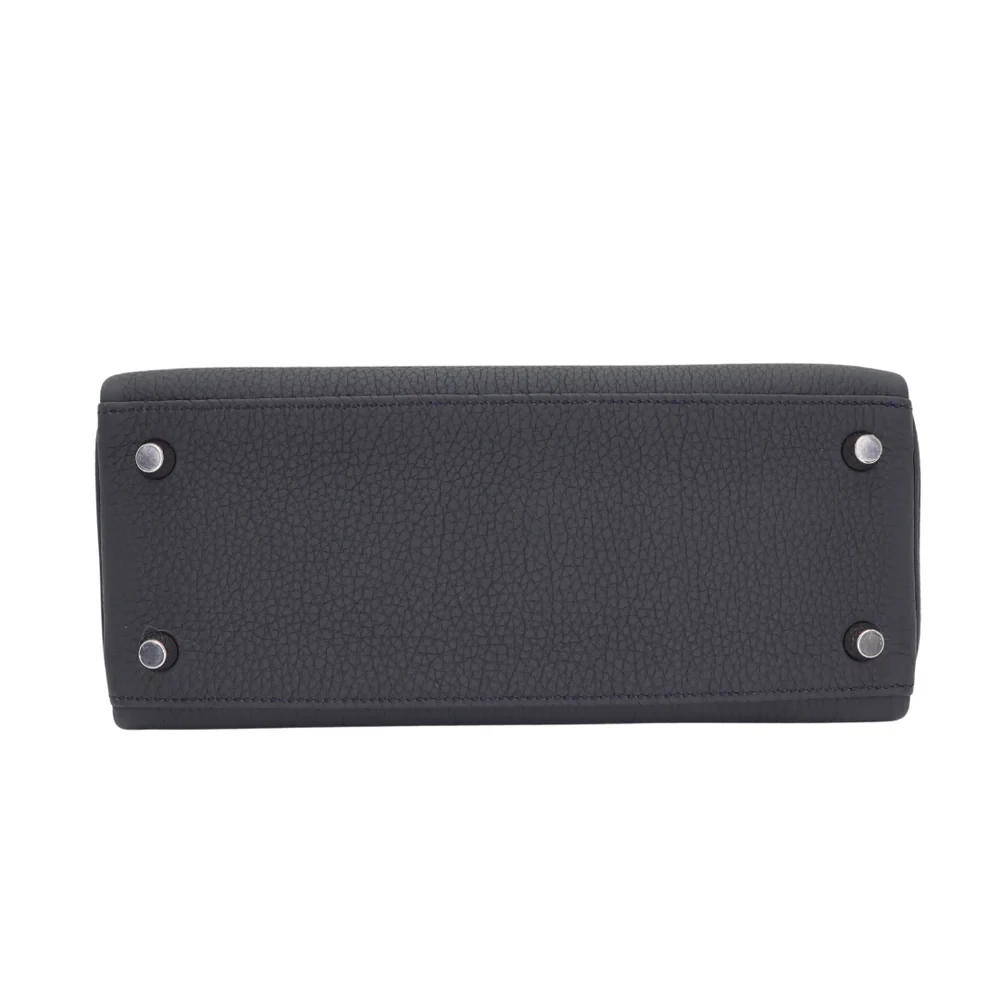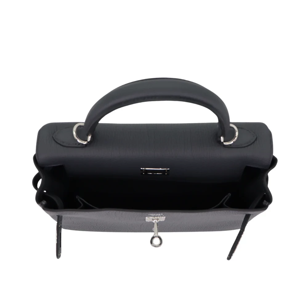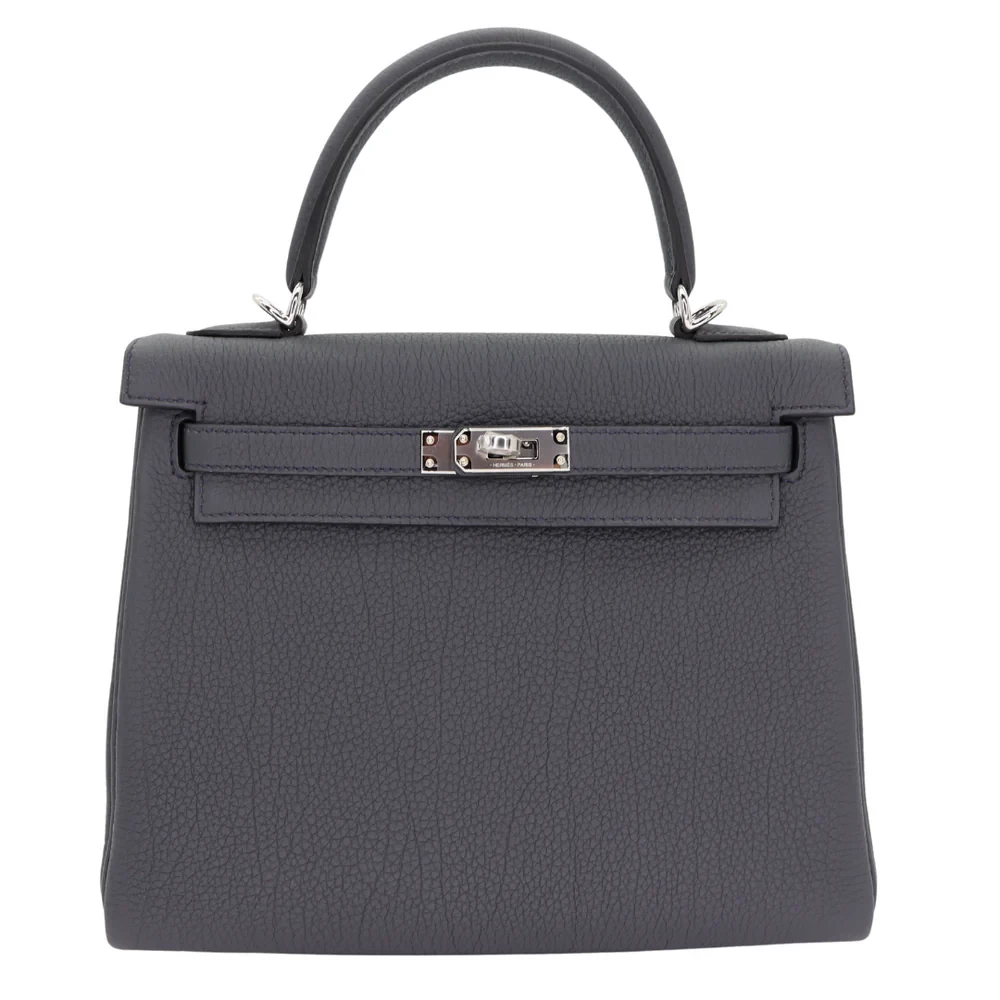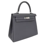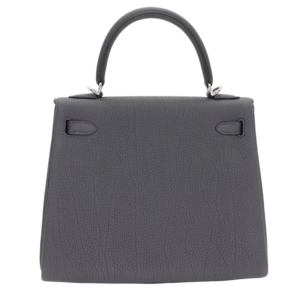 This Hermès style Kelly 25 features Gris Misty Togo. Palladium hardware complements the grey. The retourne style offers relaxed charm. Soft leather ages beautifully. Perfect for daily understated luxury. Cloud like comfort in every carry.