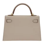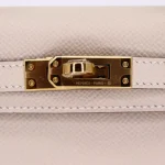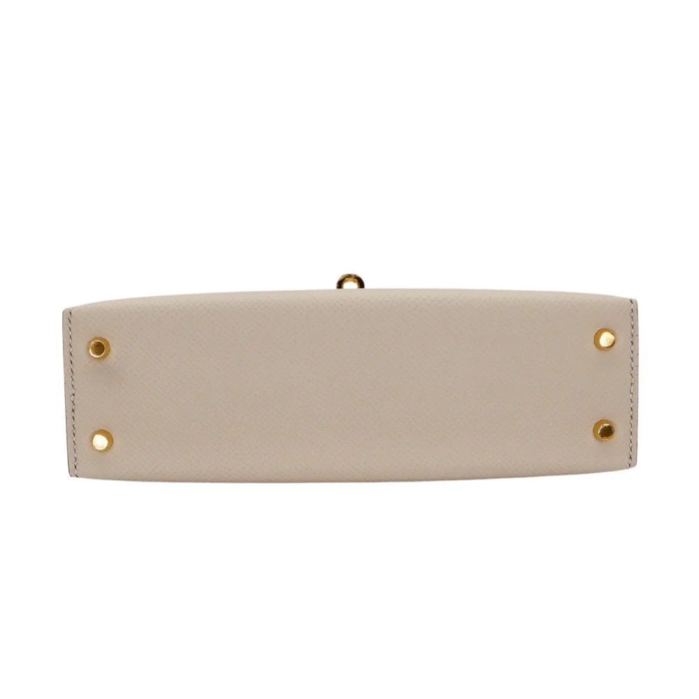 This Hermès style Kelly Mini uses Craie Epsom leather. Gold hardware warms the crisp white. The 20cm sellier style stays pristine. Stain resistant leather cleans easily. Perfect for weddings or summer events. Pure luxury for fresh starts.