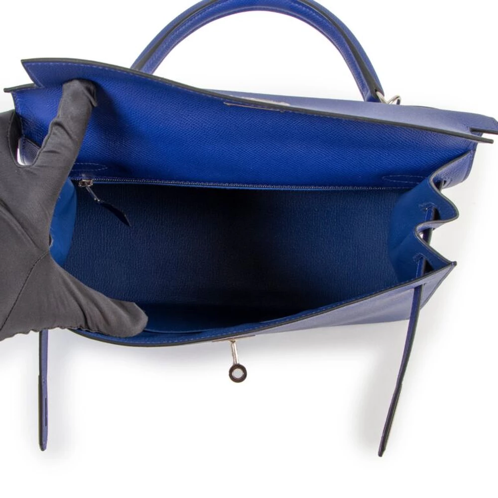 This Hermès inspired Kelly 32 radiates in Bleu Electrique Clemence leather for electric blue energy. Palladium hardware accents the relaxed, slouchy design. The 32cm spacious interior fits tech gadgets, books, and essentials. Clemence leather ages gracefully and resists wear. Style with black or white for bold contrast. Perfect for concerts, travel, or statement errands. Voltage in every stitch.