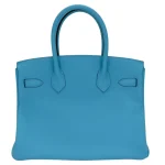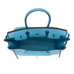 This Hermès inspired Birkin 30 features Bleu Du Nord Togo leather, a soft sky blue tone. Gold hardware warms the 30cm silhouette for timeless appeal. Soft Togo leather resists scratches and ages gracefully. Roomy enough for tablets or notebooks. Pair with white or pastels for serene elegance. Office ready or weekend approved. Sky inspired sophistication.