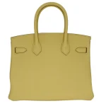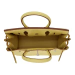 This Hermès inspired Birkin 30 in Jaune Poussin uses sunny yellow Togo leather. The silver palladium hardware keeps the look fresh and fun. The 30cm size is great for beach trips or errands. The cheerful color brightens even the gloomiest day. Carry it by hand or over your shoulder for easy style. It’s a burst of joy in bag form. Perfect for spreading positivity!