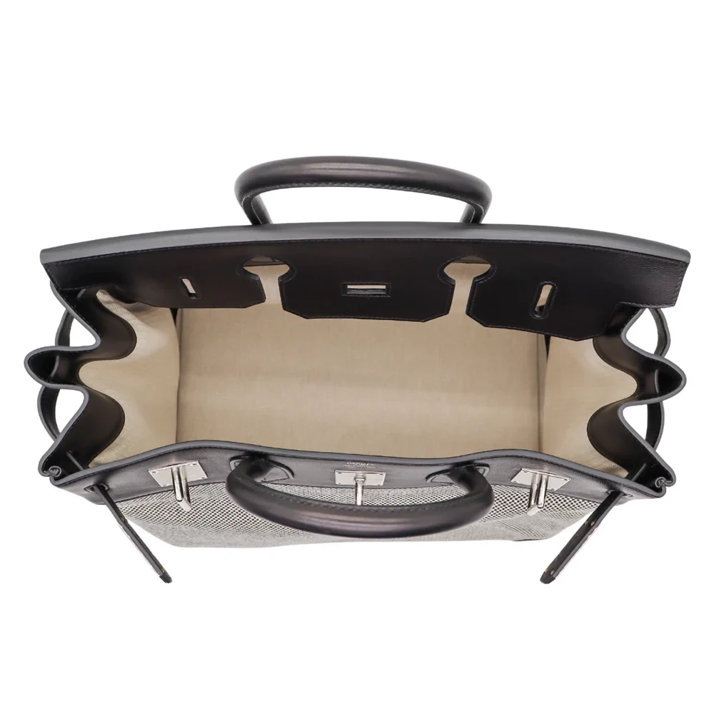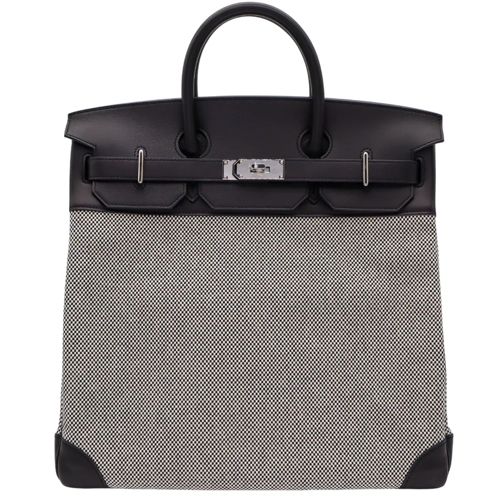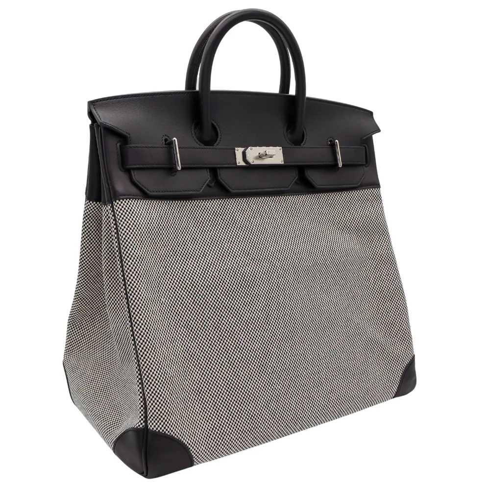 This Hermès style HAC 40 combines Black Toile canvas and Swift leather. Palladium hardware adds utilitarian chic. The 40cm size organizes work essentials neatly. Durable materials withstand daily commutes. Perfect for urban professionals seeking casual elegance. Rugged luxury for practical lifestyles.