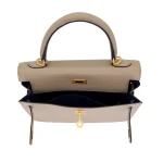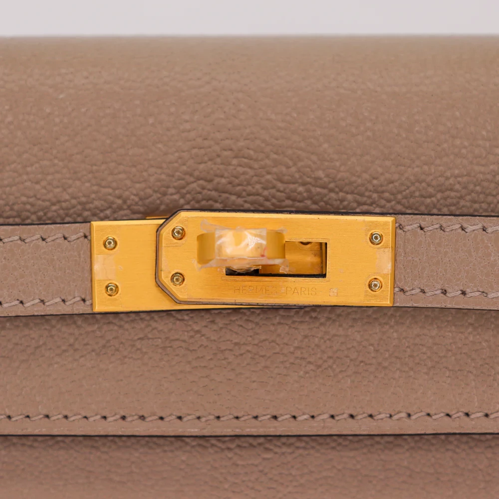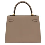 This Hermès style Kelly 25 combines Gris Tourterelle chèvre. Brushed gold hardware adds subtle shine. The 25cm sellier style stays structured. Soft leather molds to your body. Perfect for polished professionalism. Quiet luxury with golden whispers.