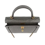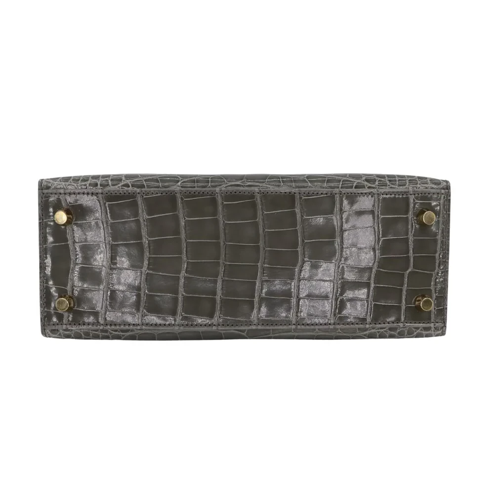 This Hermès inspired Kelly 25 Sellier features Gris Cement Shiny Alligator leather in cool, urban grey. Gold hardware elevates the structured Sellier lines and clasp. The 25cm size fits laptops, cosmetics, and essentials. Shiny alligator resists wear and stays sleek. Style with black leather or metallics for industrial chic. Built for city nights, offices, or avant garde wardrobes. Concrete elegance, perfected.