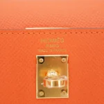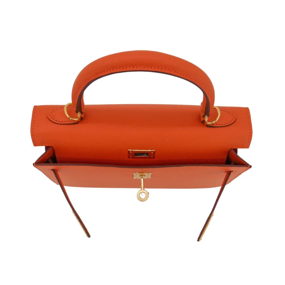 This Hermès style Kelly 25 shines in Orange Epsom leather. Gold hardware amplifies the vibrant citrus tone. The 25cm sellier design keeps essentials organized. Durable Epsom resists scratches and fading. Brightens neutral summer outfits instantly. Perfect for vacations or weekend adventures. Bold color for confident personalities.