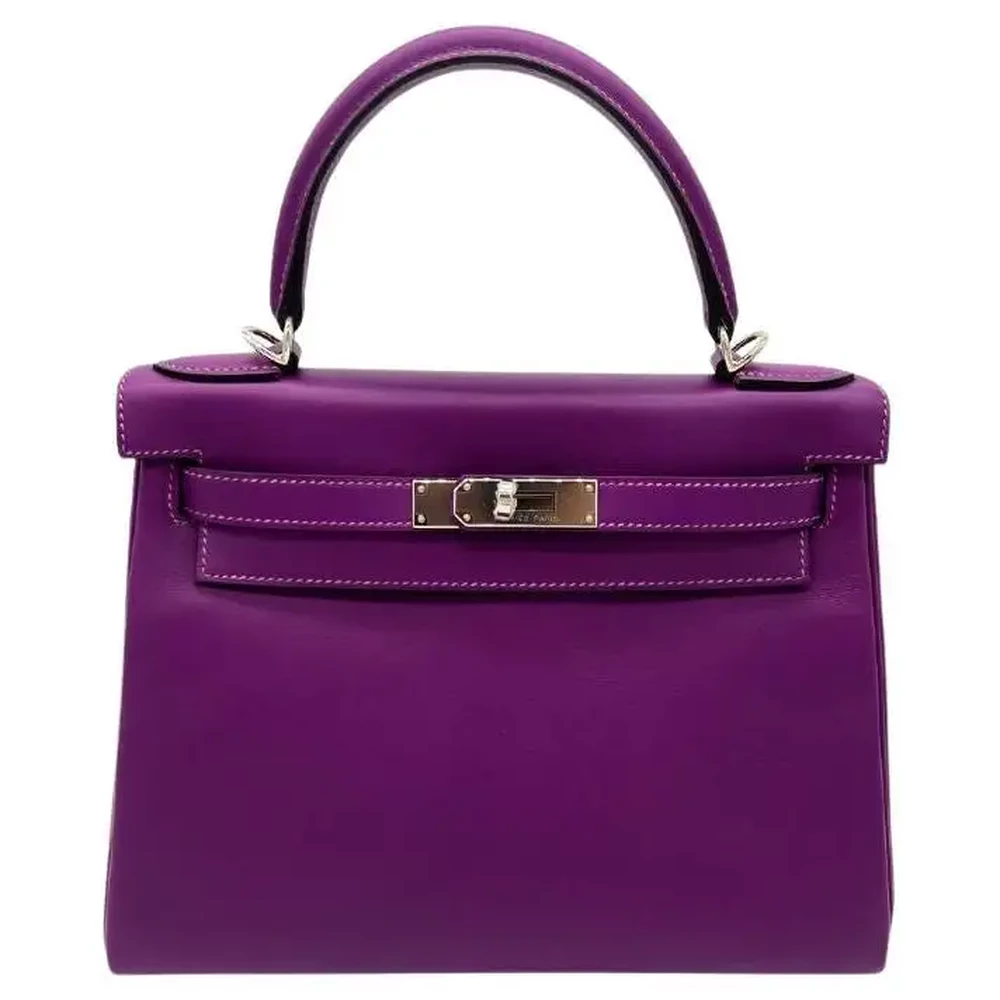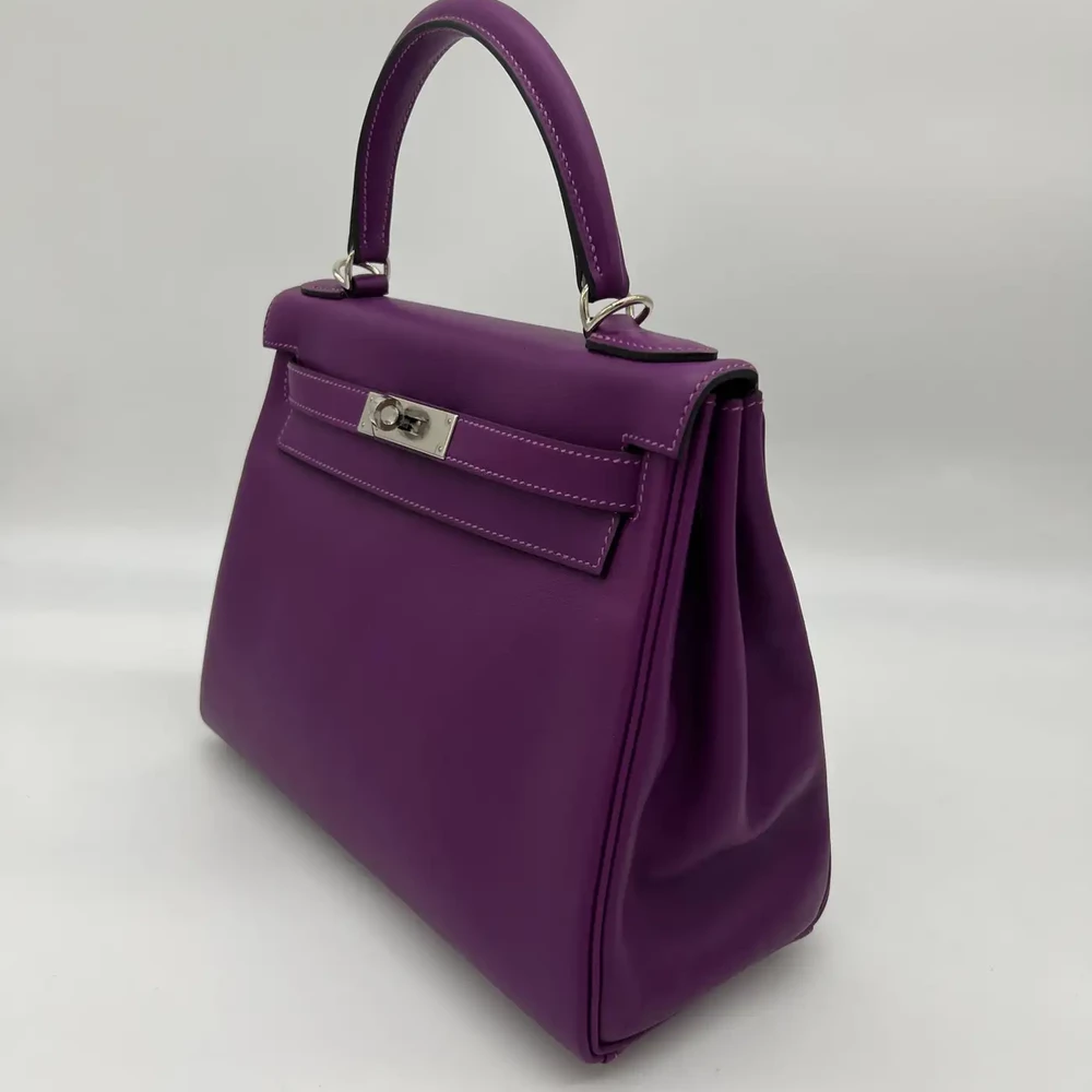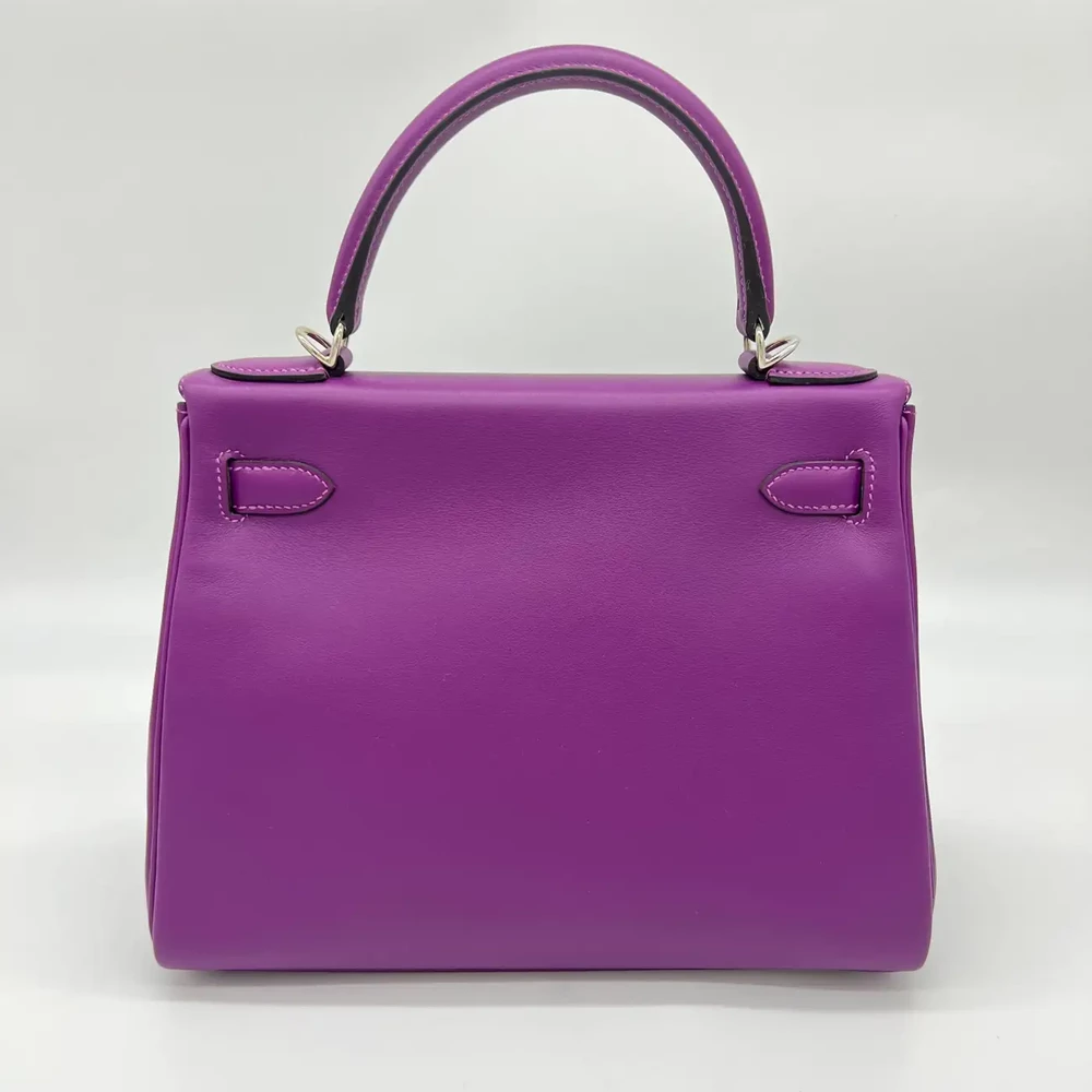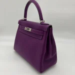 This Hermès style Kelly 28 uses Anemone Togo leather in regal purple. Palladium hardware cools the bold jewel tone. The retourne design offers relaxed elegance for daily wear. Scratch resistant leather hides minor scuffs. Pair with metallics or neutrals for contrast. Ideal for creative professionals or parties. Royal luxury for confident personalities.
