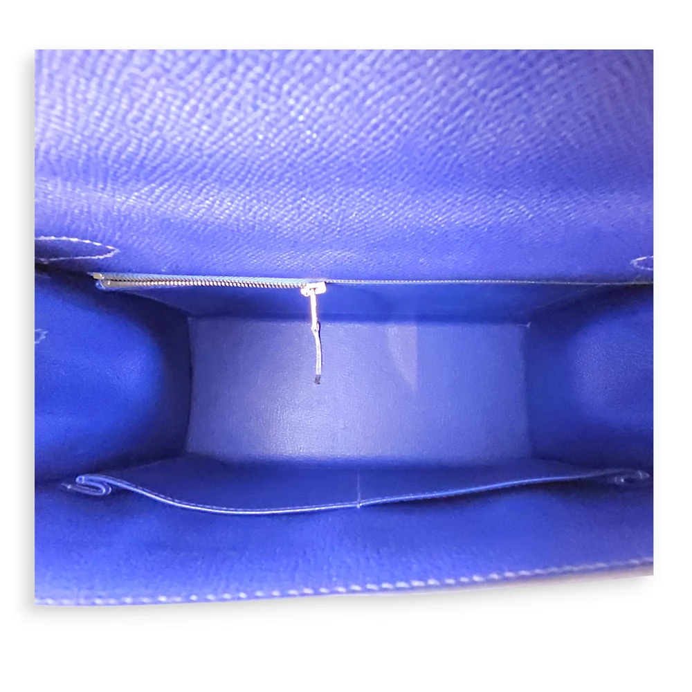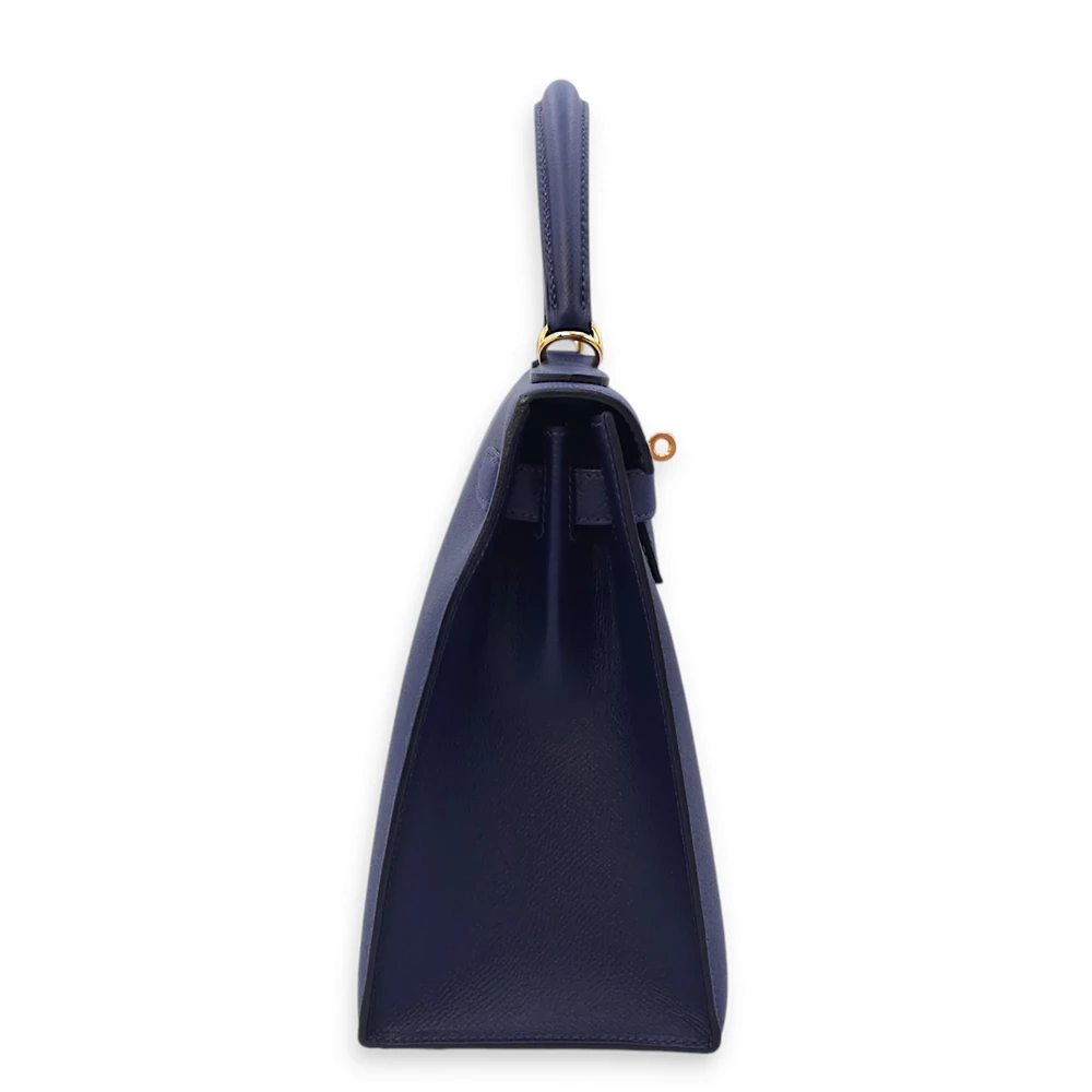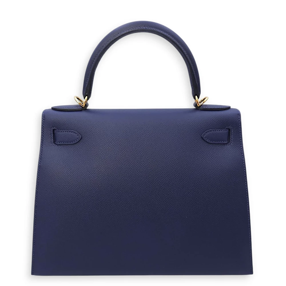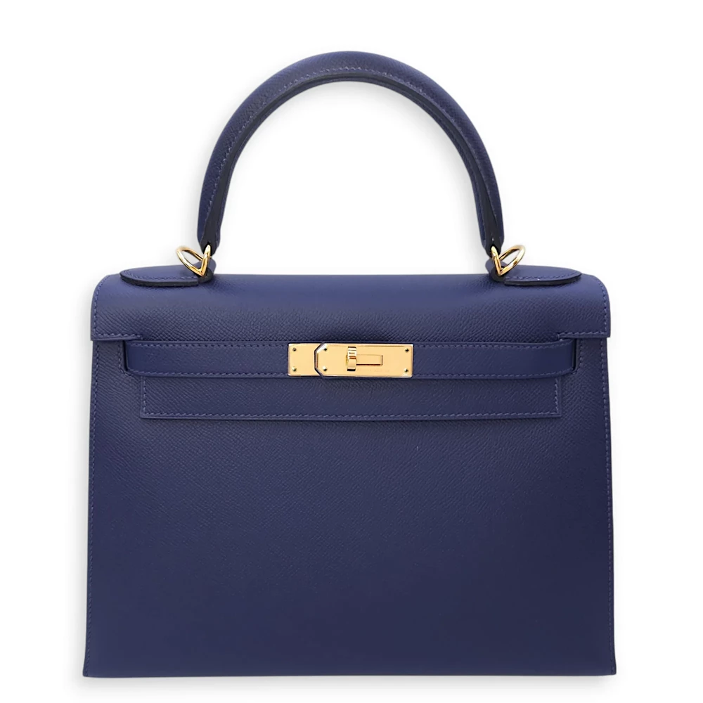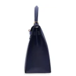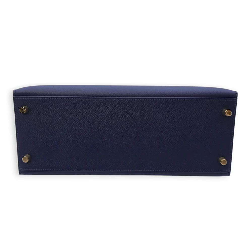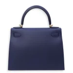 This Hermès style Kelly 28 shines in Bleu Saphir Epsom leather. Gold hardware amplifies the jewel toned blue. The sellier design holds work files and tablets securely. Stain resistant surface stays pristine for years. Perfect with navy suits or metallic accessories. A boardroom staple for executives. Timeless elegance with maritime charm.