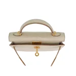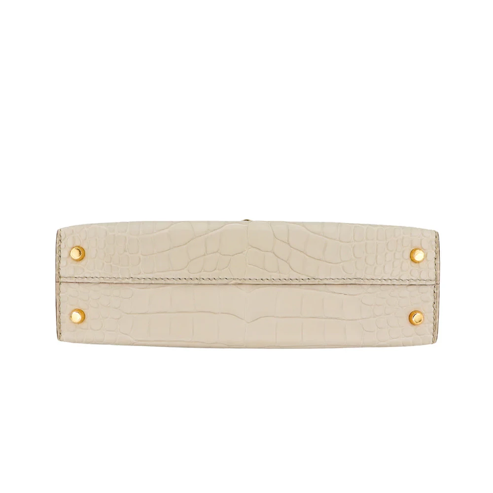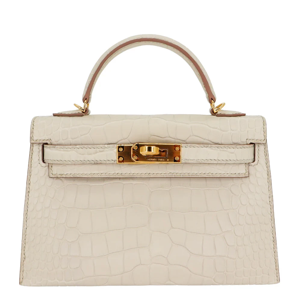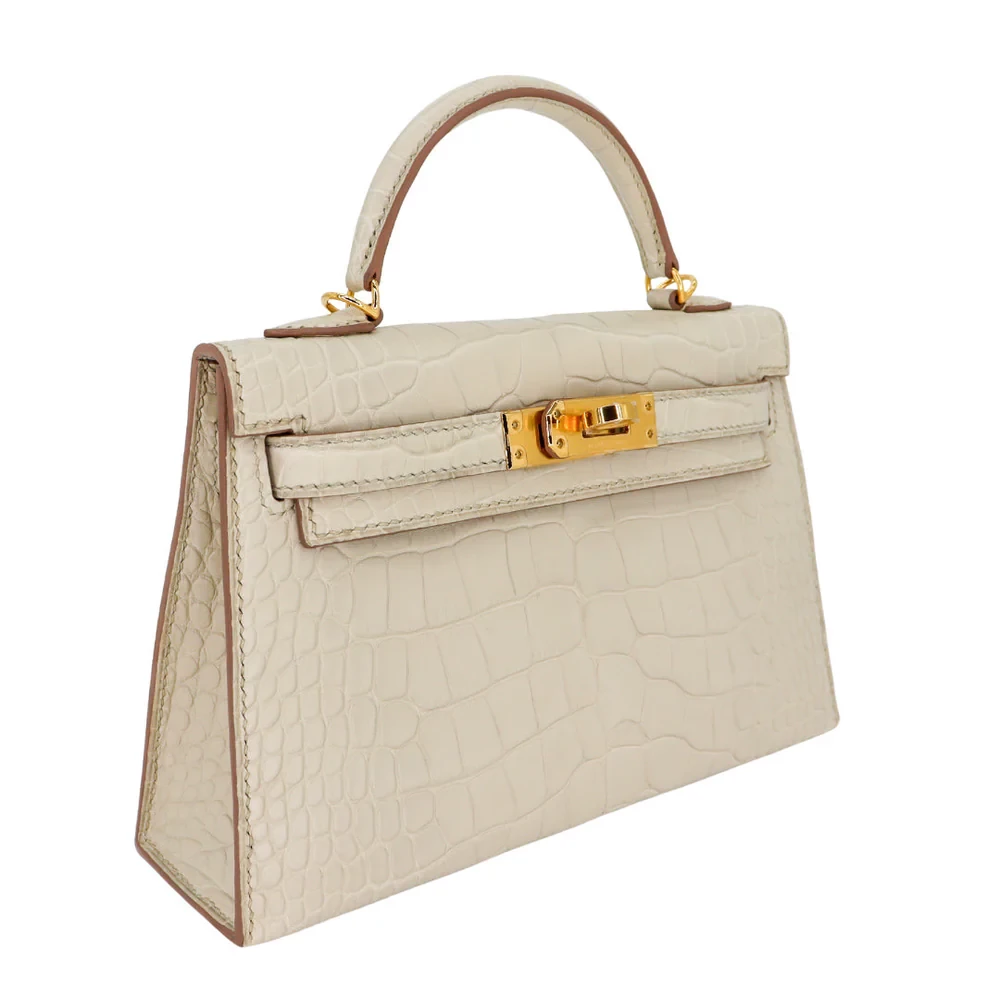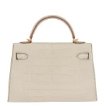 This Hermès inspired Kelly II Sellier Mini uses Beton matte alligator leather for soft, concrete grey minimalism. Gold hardware contrasts the structured Sellier lines and compact design. The mini size holds phones, keys, and cosmetics. Matte alligator resists scratches and stays understated. Style with monochromes or metallics for urban polish. Ideal for offices, travel, or minimalist wardrobes. Quiet confidence, reimagined.