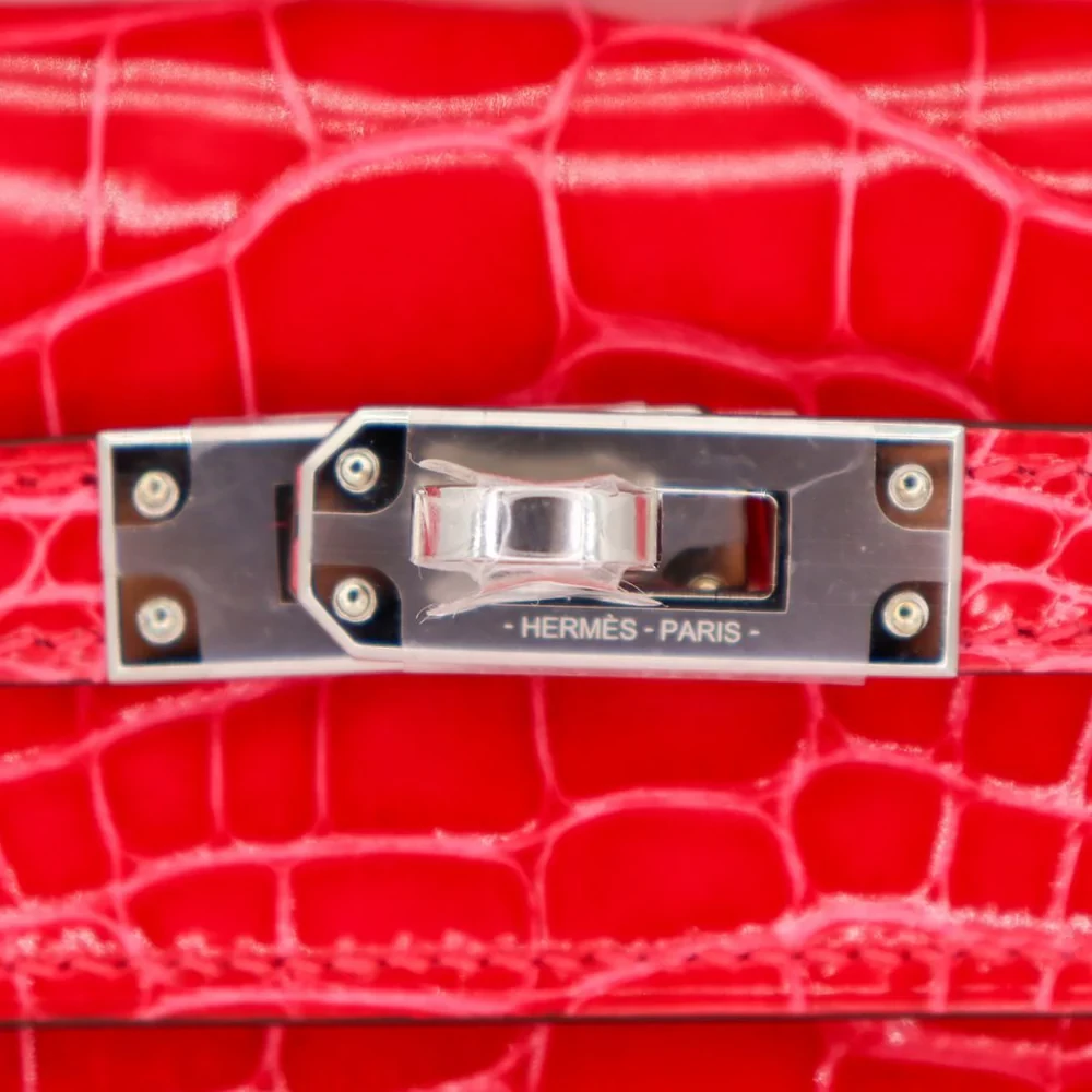 This Hermès inspired Kelly Pochette glows in Rose Extreme Shiny Alligator leather for electric pink allure. Palladium hardware accents the compact, structured silhouette. The pochette size fits lipsticks, cards, and small luxuries. Shiny alligator resists scratches and stays eye catching. Pair with monochromes or metallics for fearless pop. Ideal for parties, festivals, or summer nights. Vibrant audacity, mastered.