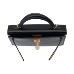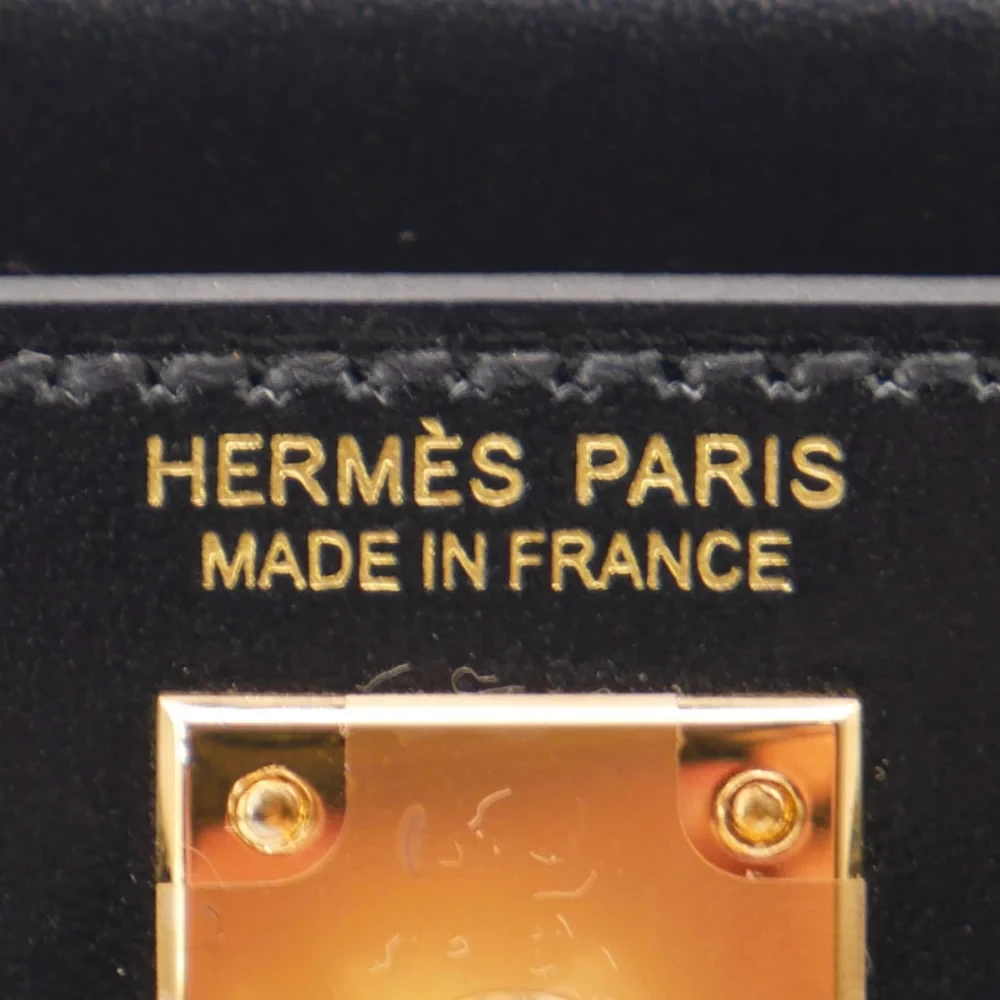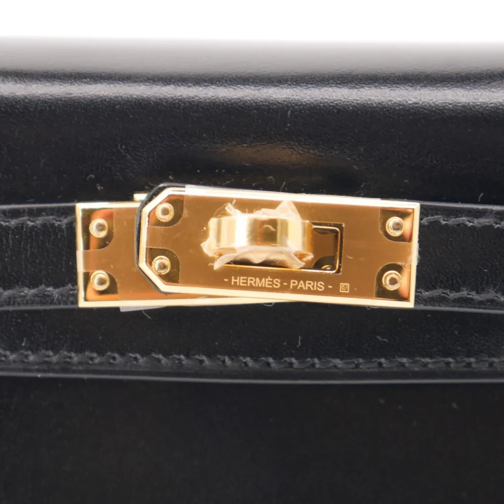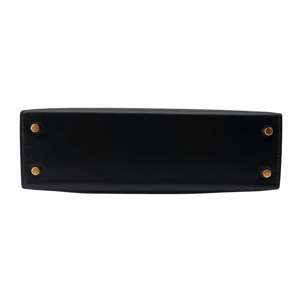 This Hermès style Kelly Mini features Black Box Calf leather. Gold hardware adds classic contrast. The 20cm sellier design stays mirror polished. Scratch resistant surface maintains its shine. Elevates evening wear or office attire. Your perfect little black bag redefined. Timeless sophistication in miniature.