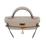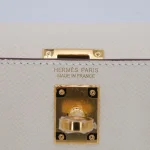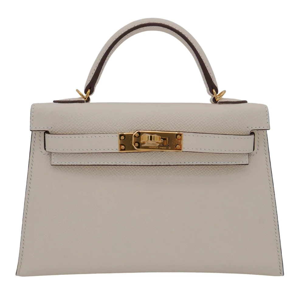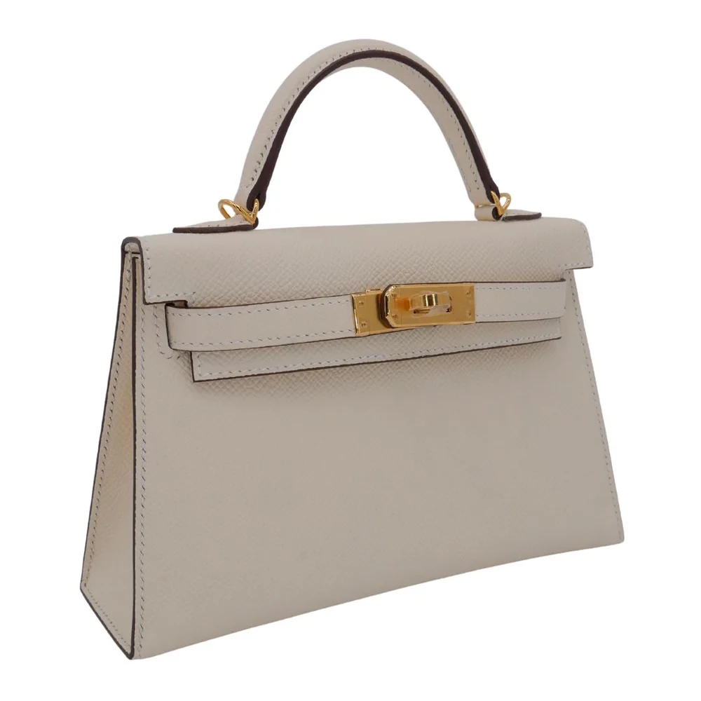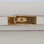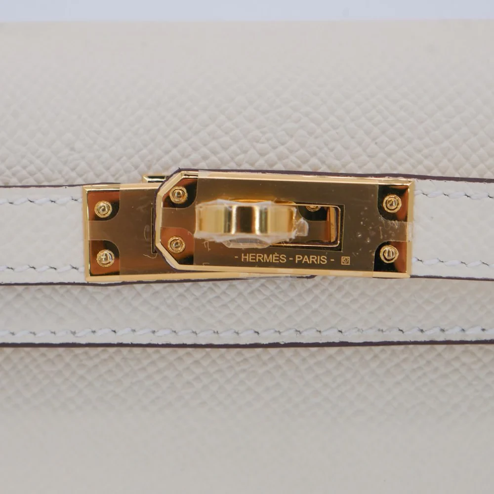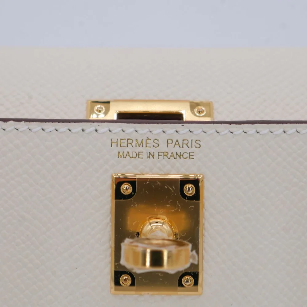 This Hermès style Kelly Mini features Nata Epsom in creamy white. Gold hardware adds warmth to the neutral tone. The 20cm sellier style stays structured and pristine. Durable leather resists stains and scuffs. Perfect with summer dresses or casual jeans. Your go to bag for weddings or daytime events. Clean luxury for timeless moments.