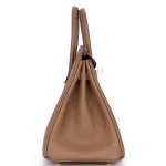This Hermès Birkin 25 features Togo Alezan (chestnut brown) leather for warm, earthy tones. Gold hardware adds richness to the structured design. The 25cm size holds tablets, wallets, and essentials. Togo leather resists scratches and stays soft. Pair with neutrals or metallics for autumnal elegance. Ideal for work, travel, or cozy days. Rustic sophistication.