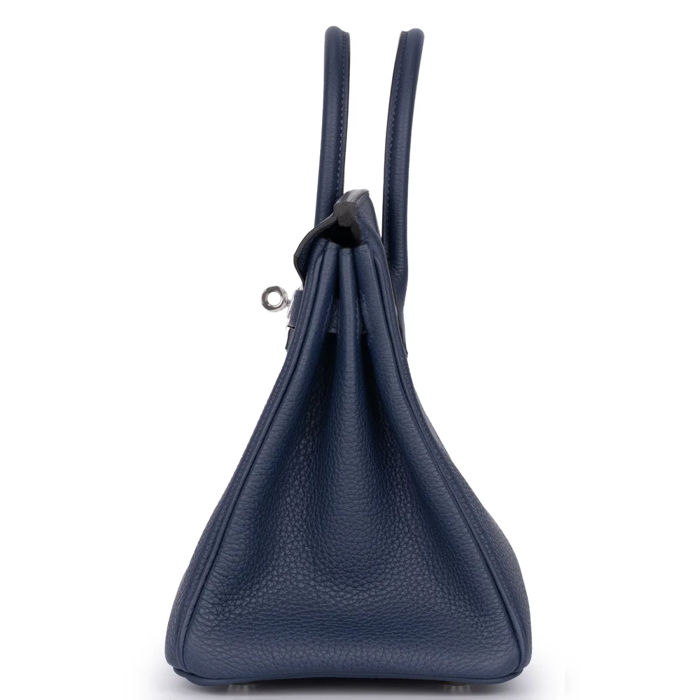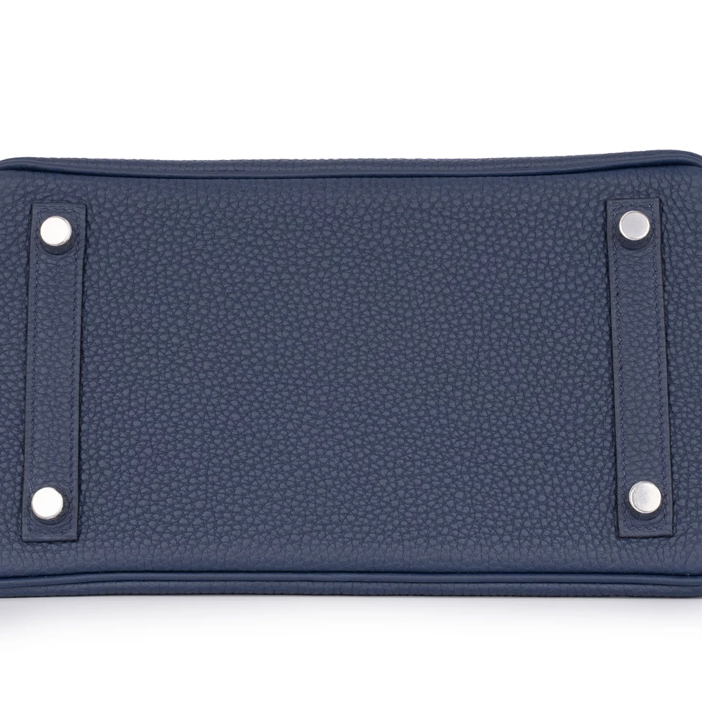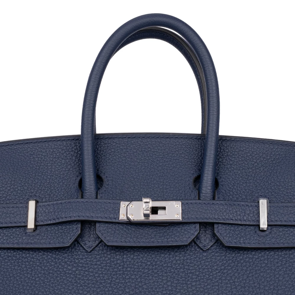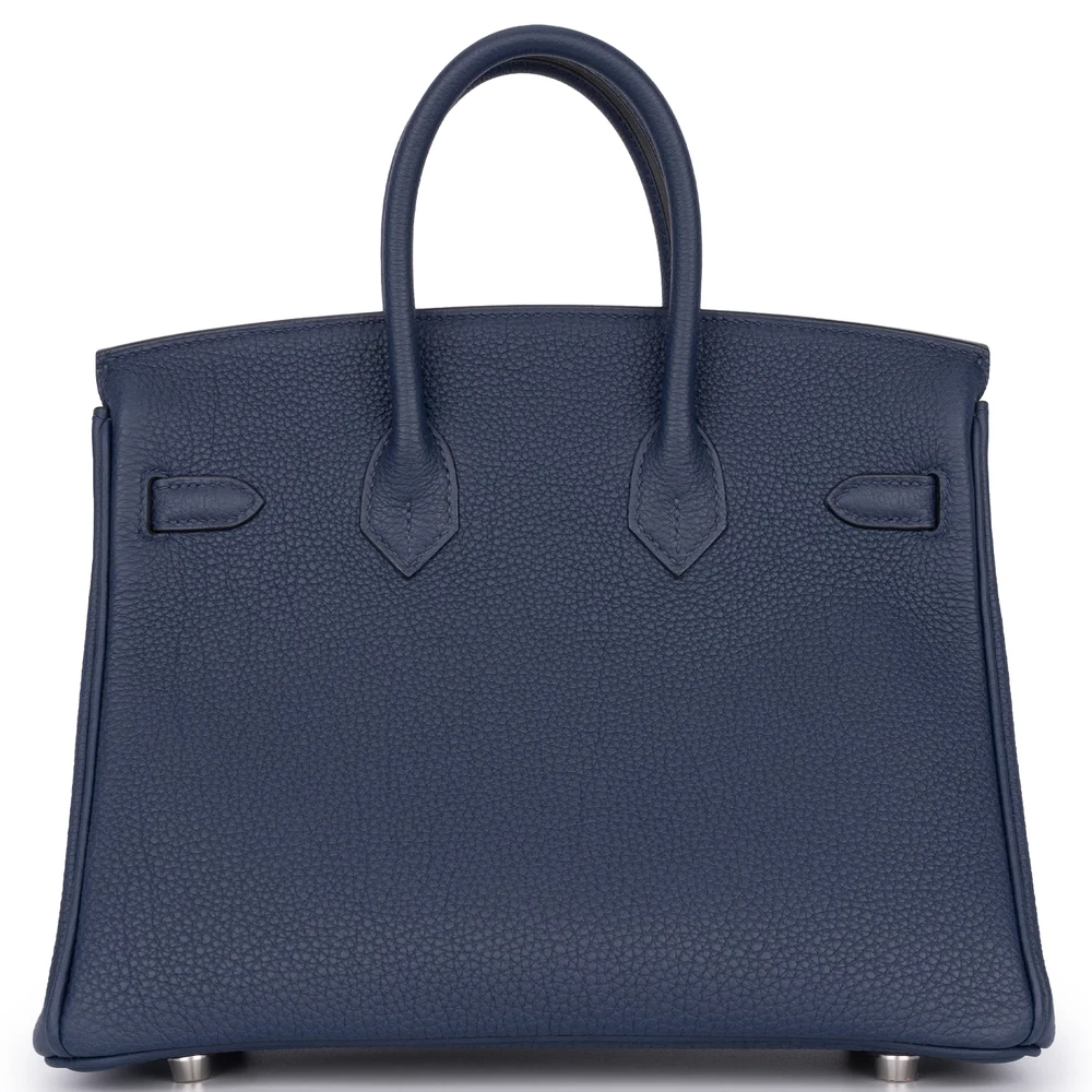 This Hermès Birkin 25 uses Bleu de Prusse (navy blue) Togo leather for classic sophistication. Palladium hardware accents the structured silhouette. The 25cm size fits laptops, cosmetics, and daily items. Togo leather resists wear and stays soft. Pair with tailored suits or casual jeans. Built for offices, dinners, or travel. Timeless polish.