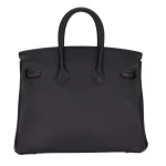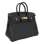 This Hermès style Birkin 25 combines black and gold Chèvre leather. The gold hardware matches the bold two tone design. The 25cm size is lightweight and easy to carry. The leather stays smooth and resists wear. Pair it with neutral tones to let the gold pop. Perfect for parties or special occasions. A glamorous bag that feels luxurious.