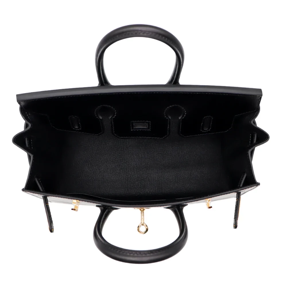 This Hermès inspired Birkin 25 in Black Box Calf is the ultimate classic. The gold hardware adds a luxurious contrast to the sleek black leather. The 25cm Sellier design keeps it sharp and structured. It fits your phone, wallet, and lipstick with precision. Pair it with anything from jeans to evening gowns. A bag that never goes out of style. Timeless elegance made affordable.