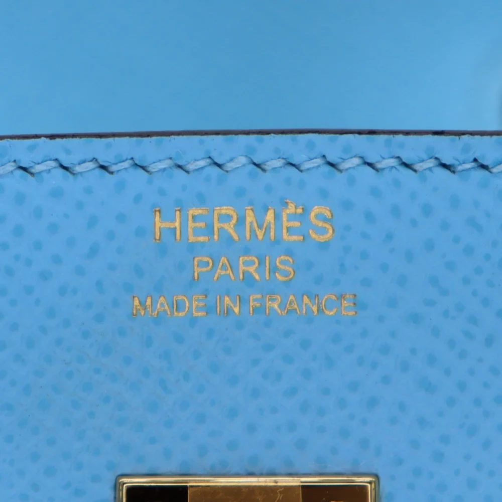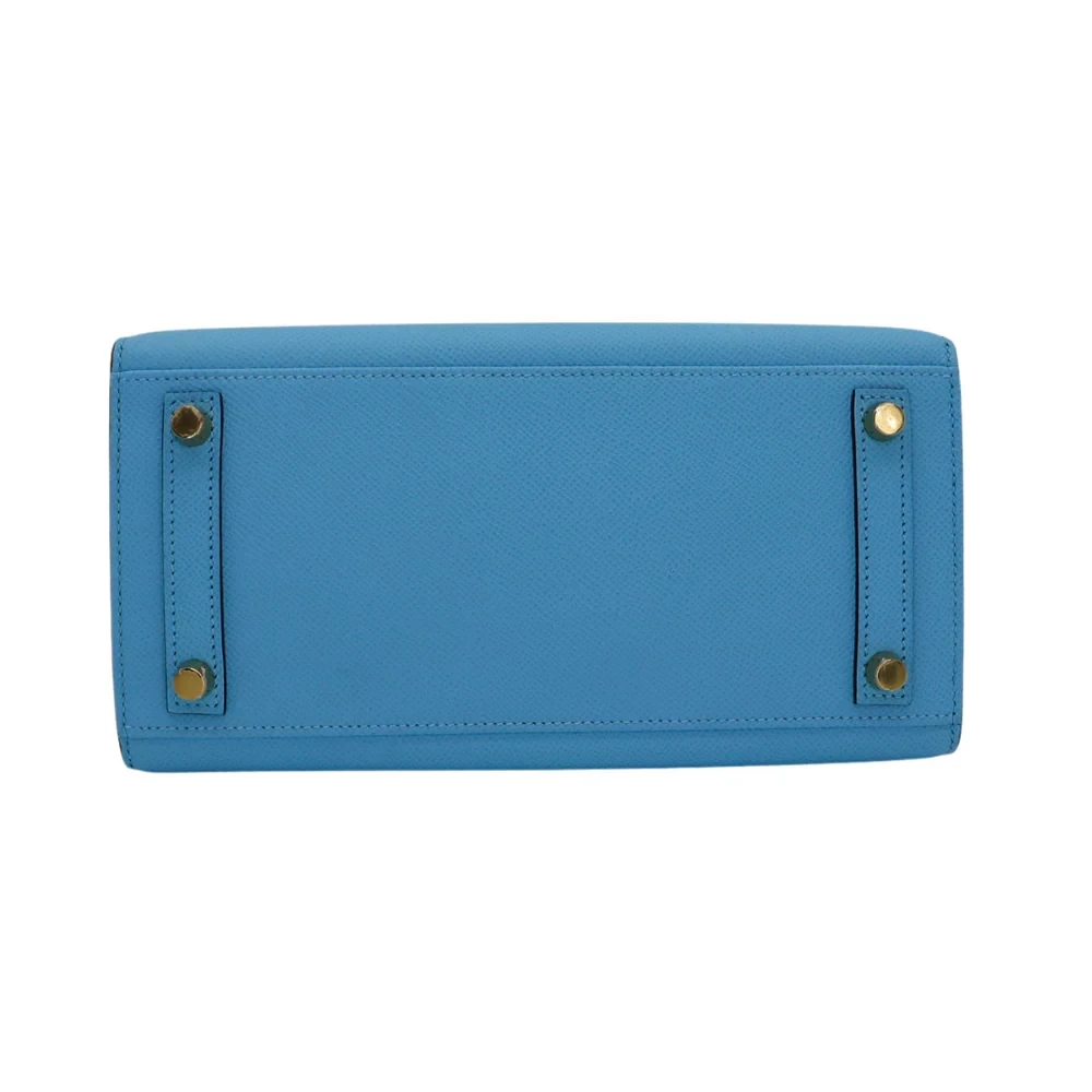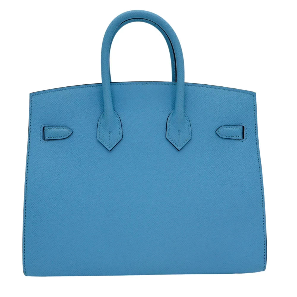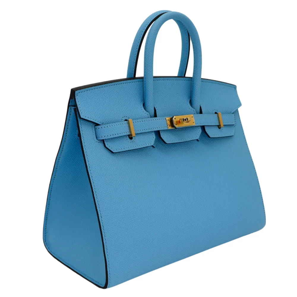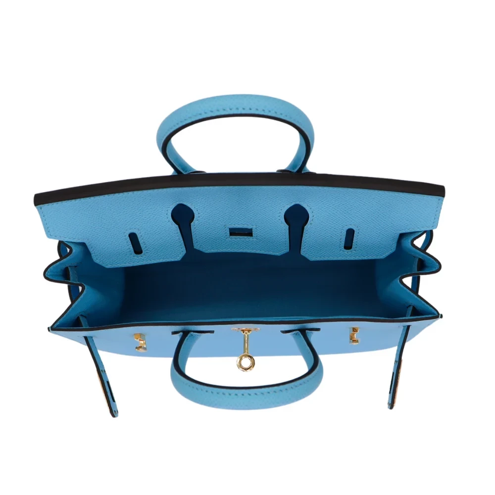 This Hermès inspired Birkin 25 shines in sky blue Epsom leather. The gold hardware adds a sunny, cheerful vibe. The Sellier design keeps it crisp and elegant. The 25cm size holds your phone, cards, and sunglasses. The bright color is perfect for summer vacations. Durable leather resists daily wear. A bag that brings sunshine wherever you go.