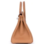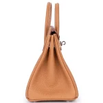 This Hermès inspired Birkin uses Veau Togo Gold leather for rich, pebbled texture. Palladium hardware balances the warm gold hue with cool contrast. The spacious design fits laptops, books, and travel gear. Togo leather resists scratches and stays lightweight. Pair with neutrals or jewel tones for radiant elegance. Built for work, events, or everyday polish. Timeless versatility.