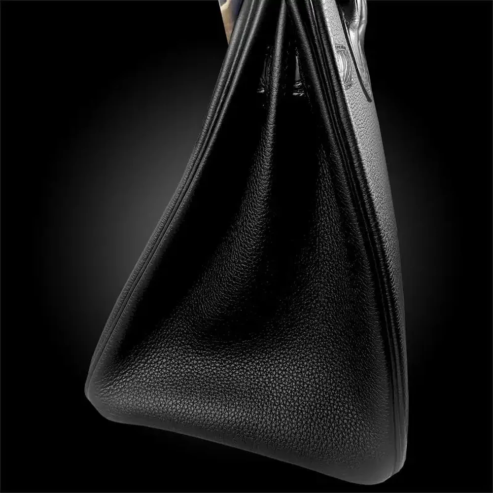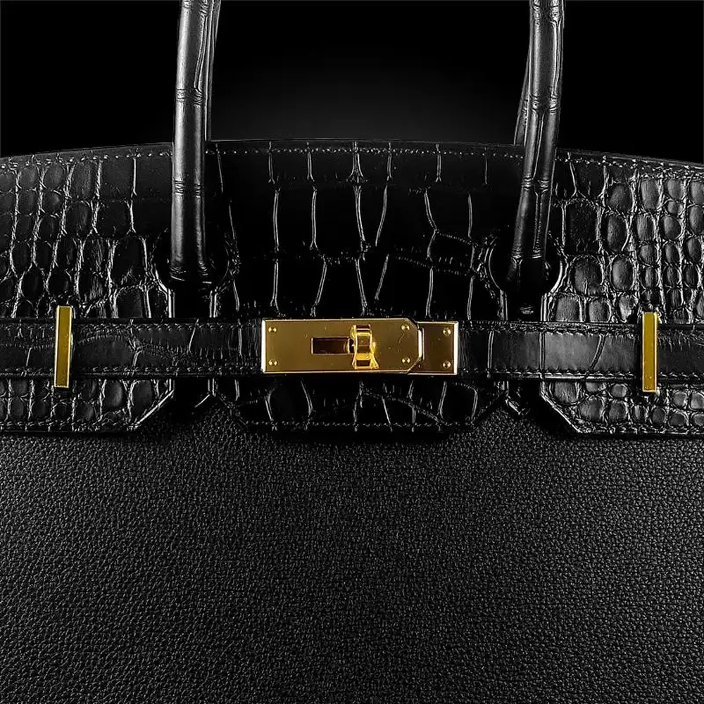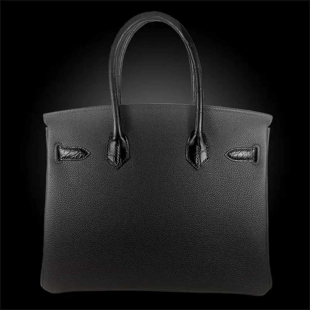 This Hermès inspired Birkin 30 Touch layers Black Togo leather with glossy Niloticus crocodile for monochrome drama. Gold hardware elevates the slouchy, spacious silhouette. The 30cm size fits laptops, scarves, and travel gear. Togo and croc resist wear while staying luxe. Pair with metallics or red accents for bold contrast. Built for power meetings or luxury errands. Shadow and shine.