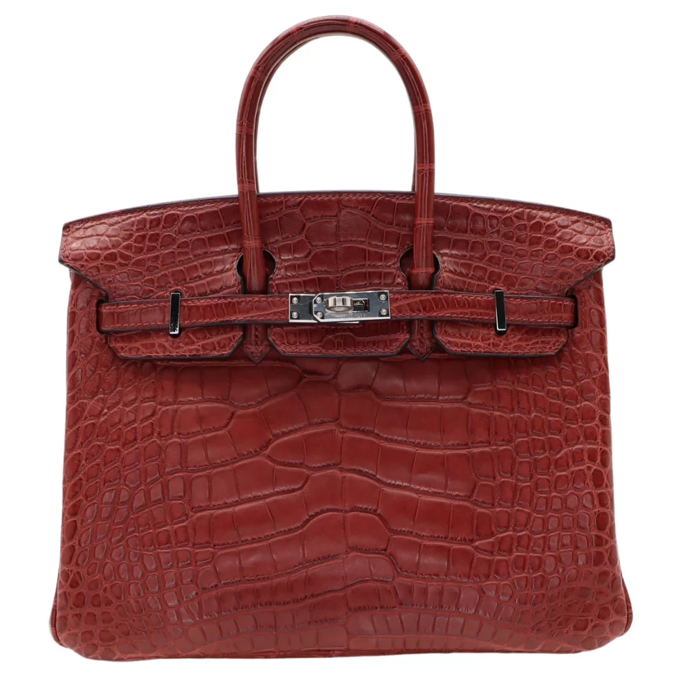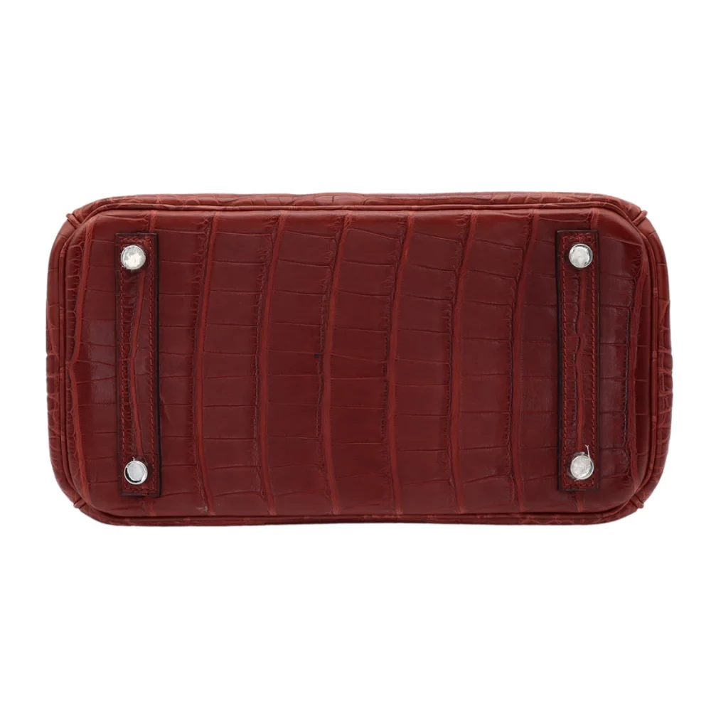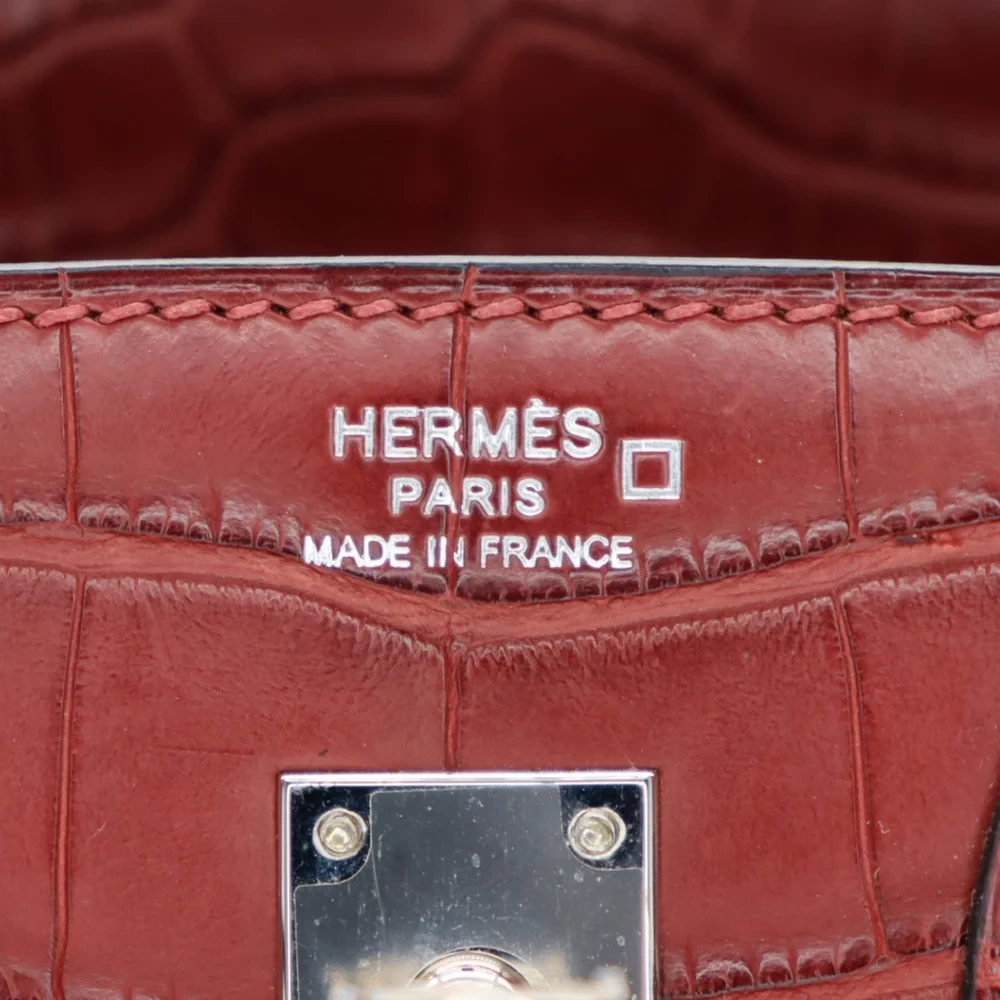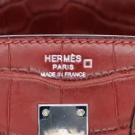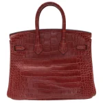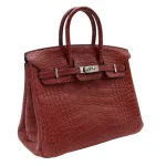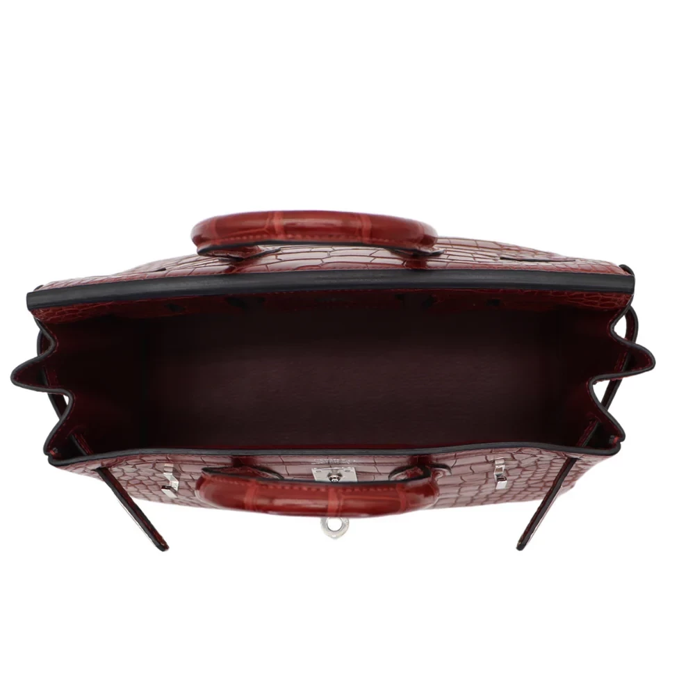 This Hermès inspired Birkin 25 in Bordeaux uses deep red matte alligator leather. The silver palladium hardware adds a cool contrast to the warm color. The 25cm size is perfect for dinners or evenings out. The dark red shade pairs beautifully with black or neutral tones. You’ll love how it feels both luxurious and understated. A bag that whispers elegance instead of shouting it.