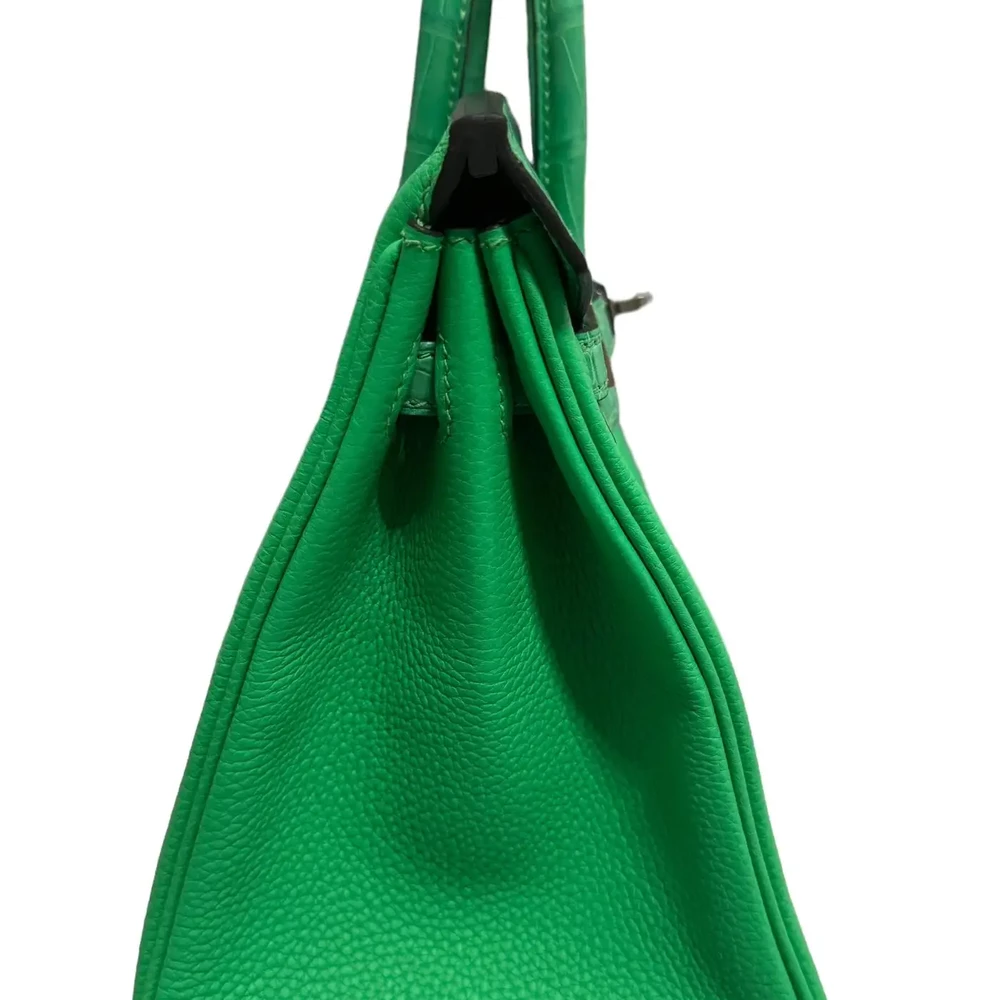 This Hermès inspired Birkin 25 Touch mixes Vert Comics Togo leather with matte alligator for striking texture play. Palladium hardware sharpens the compact, structured silhouette. The 25cm size fits phones, cards, and lipsticks. Togo and alligator resist scratches with rugged elegance. Style with black leather jackets or gold jewelry. Built for city nights or luxury weekends. Edgy sophistication unlocked.
