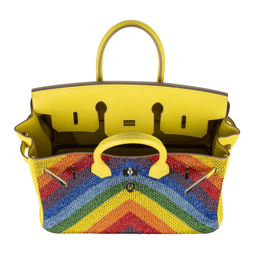 This Hermès style Birkin 25 features a Customized Rainbow Chevron pattern with Swarovski crystals. Palladium hardware balances the 25cm artsy design. Durable materials and crystals resist wear while catching light. Compact yet fits essentials like cards and keys. Pair with neutrals to let the rainbow shine. Perfect for pride events or creative souls. A kaleidoscope of joy.