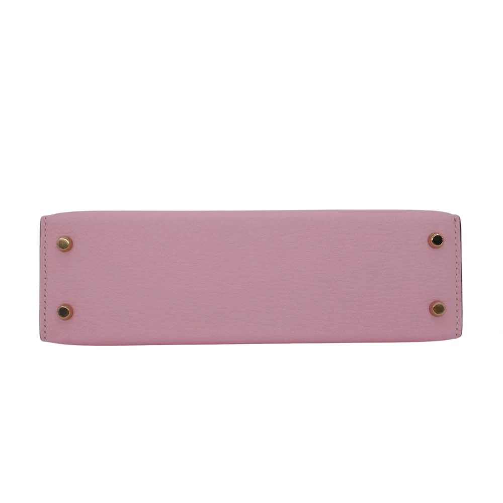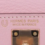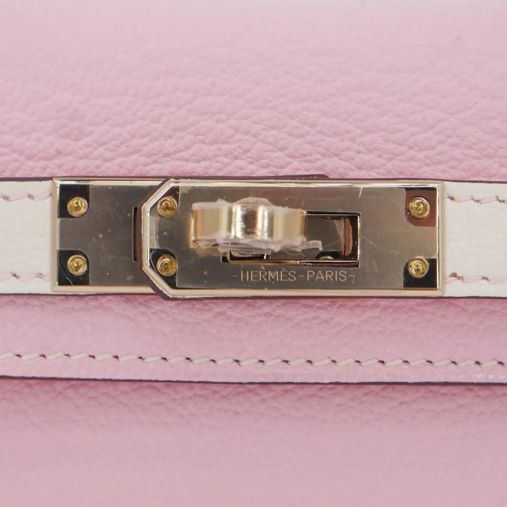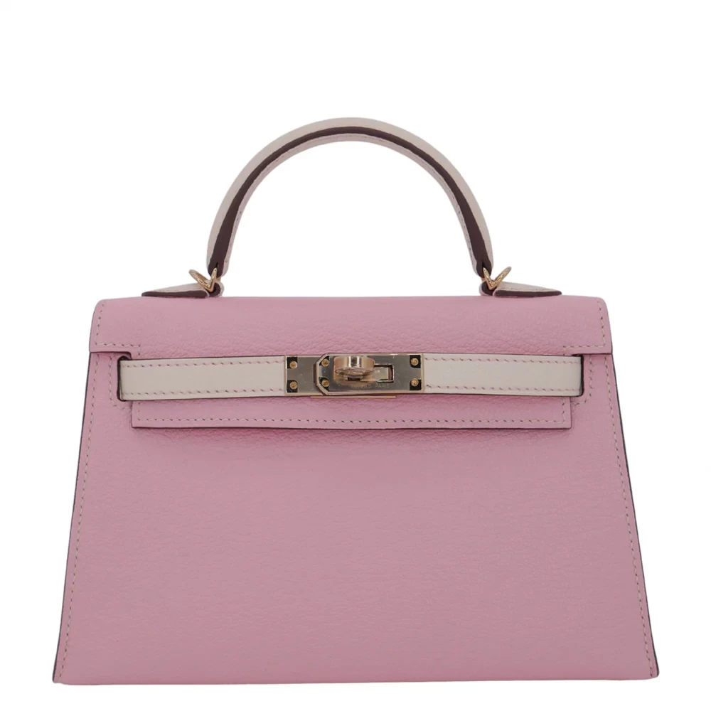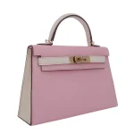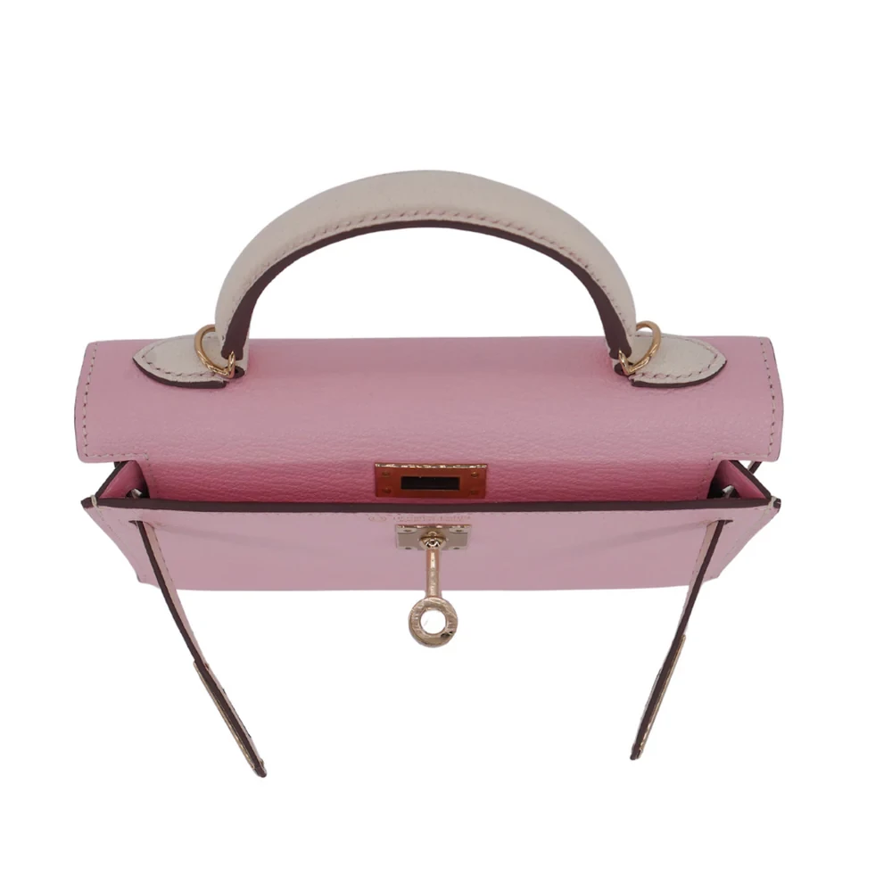 This Hermès style Kelly Mini combines Rose Sakura pink and Nata cream chèvre leather. Permabrass hardware warms the soft pastel tones. The 20cm size fits essentials while feeling featherlight. Supple chèvre molds comfortably to your body. Perfect for spring weddings or brunch dates. Two tone versatility for romantic outfits. Delicate luxury with everyday charm.