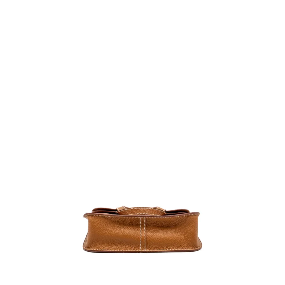 This Hermès Halzan 25 in Clemence leather and Gold with gold hardware combines classic style with luxurious appeal. The rich gold leather paired with the warm gold hardware creates a sophisticated, elegant look. The compact size and practical structure make it a versatile option for both casual and formal settings.