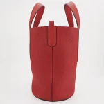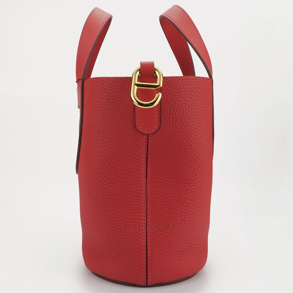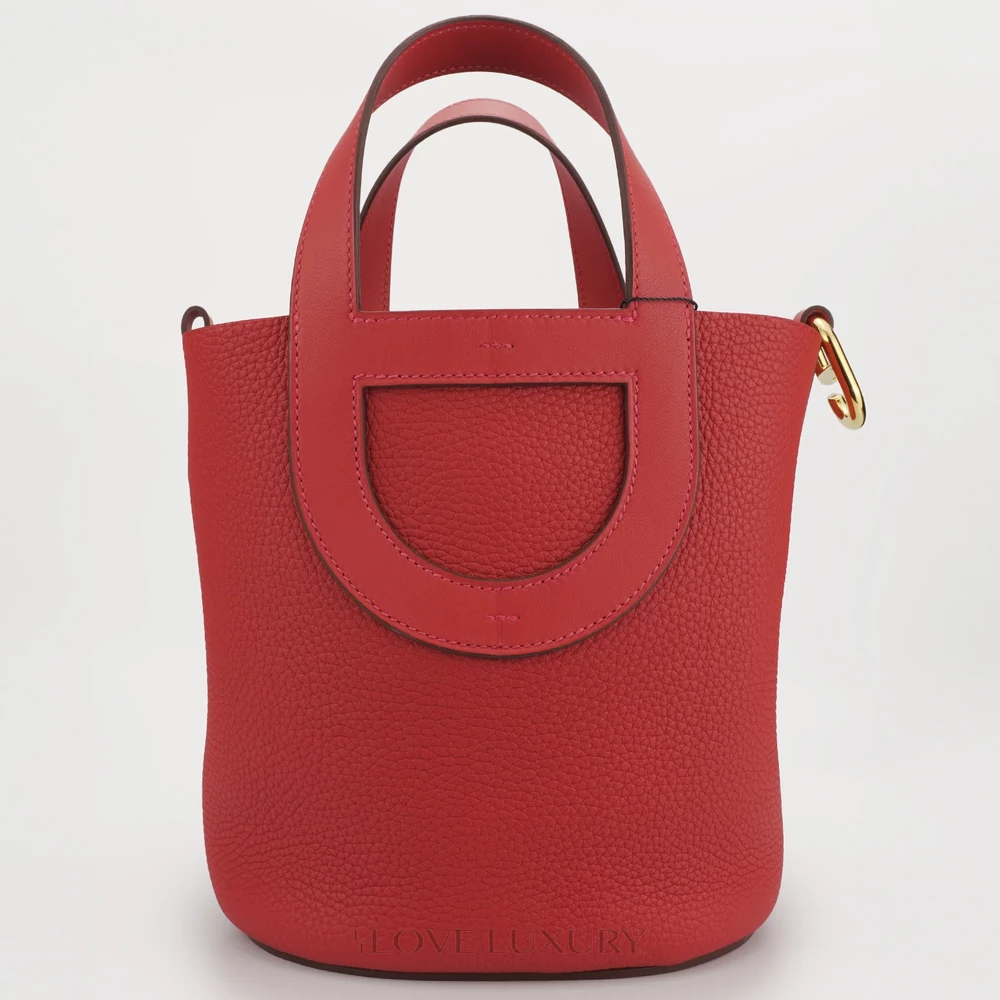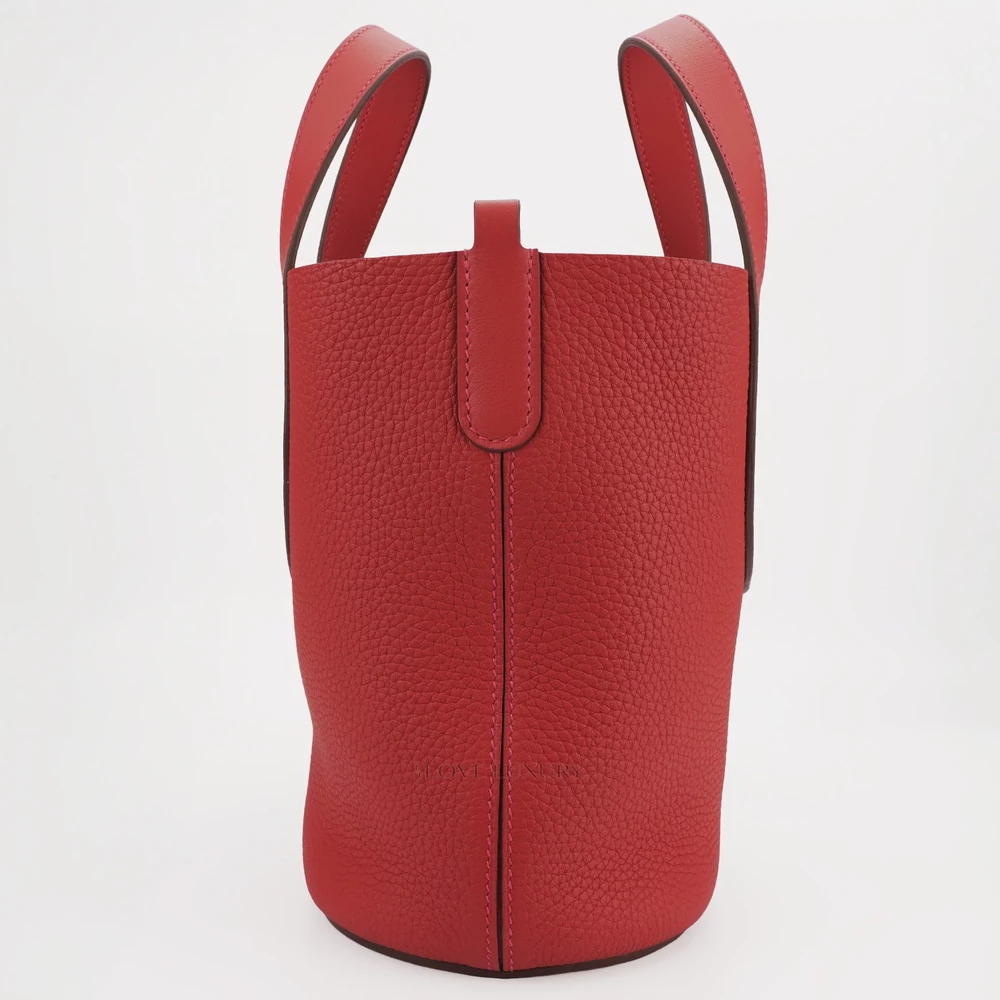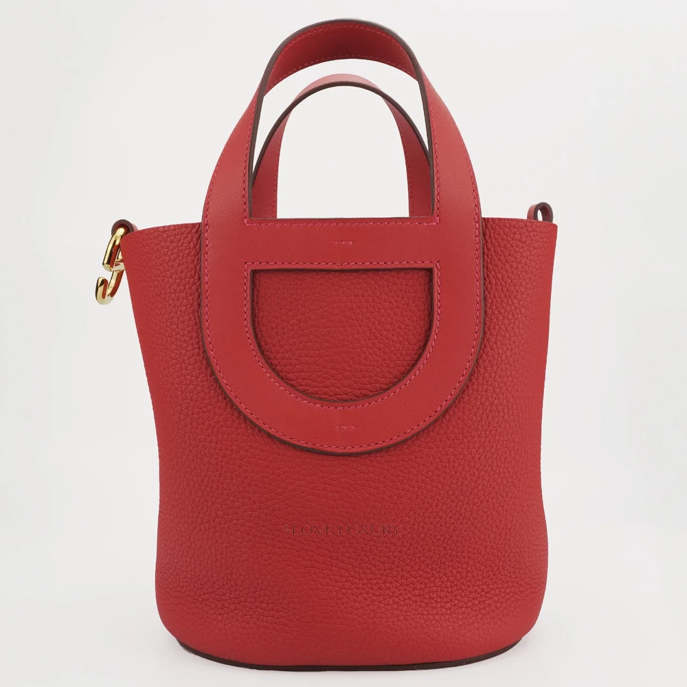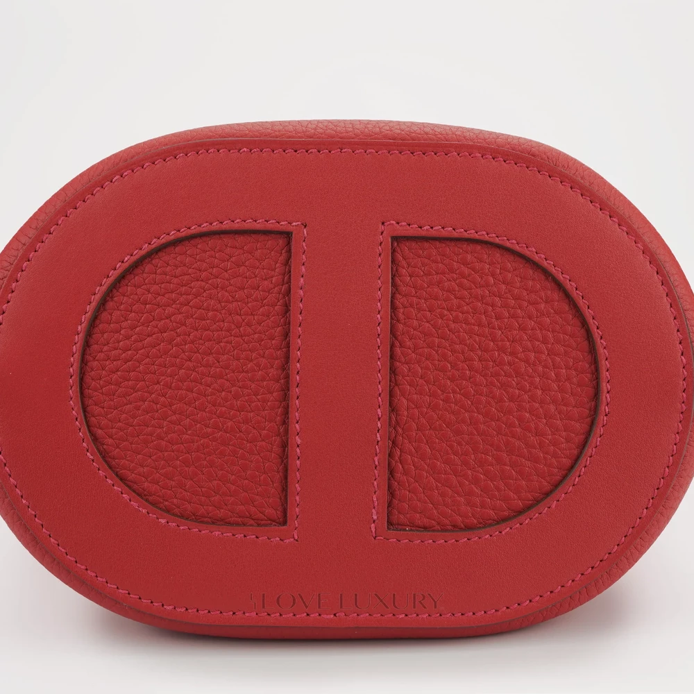 This Hermès inspired In The Loop 18 combines Clemence/Swift Vermillion (bright red) leather for playful texture. Gold hardware accents the compact, crossbody design. The 18cm size fits phones, keys, and lipsticks. Leather stays lightweight and scratch resistant. Pair with neutrals or metallics for vibrant pop. Perfect for festivals, errands, or summer days. Petite energy.
