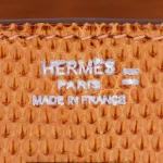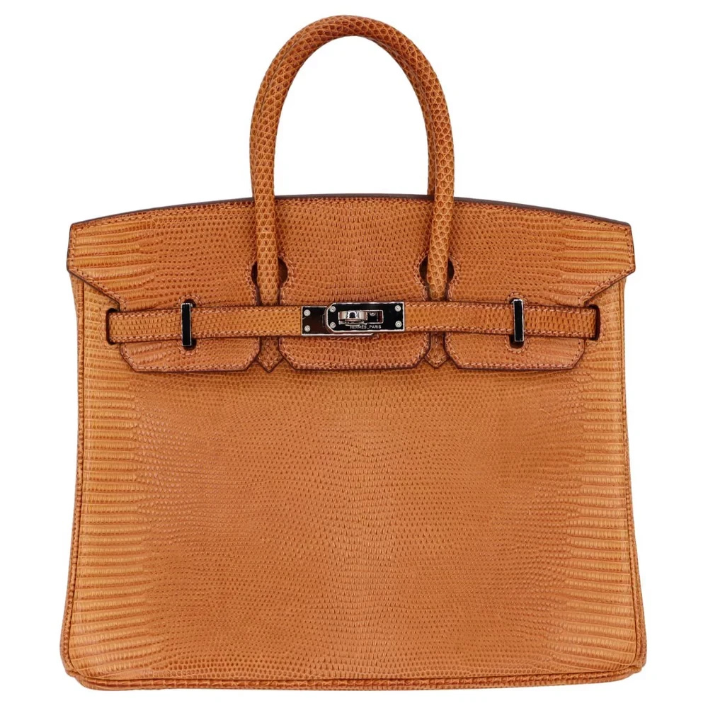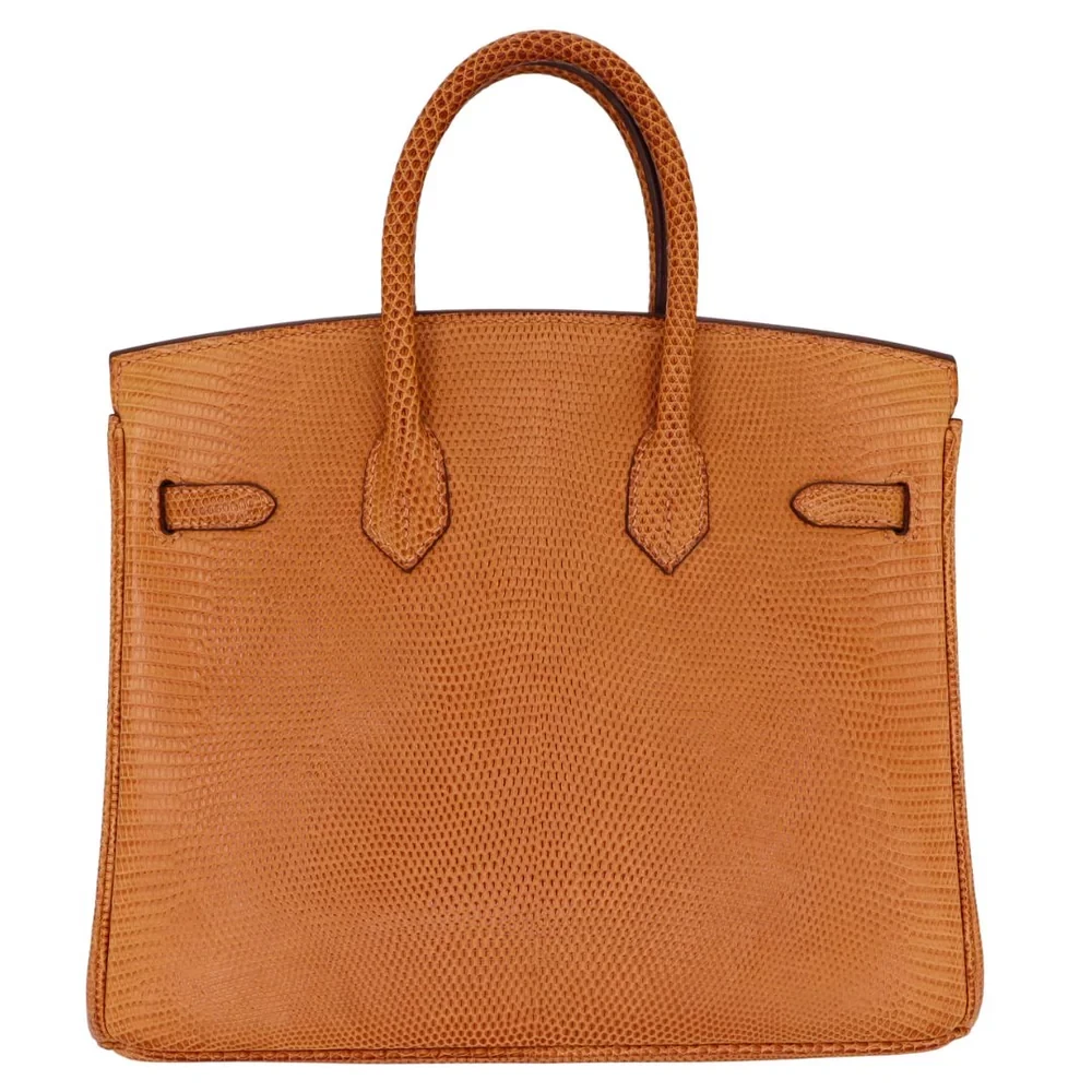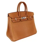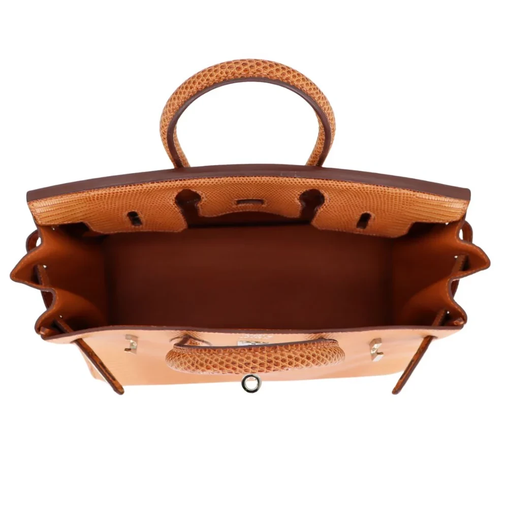 This Hermès inspired Birkin 25 features Natural Lizard leather in a warm caramel tone. Palladium hardware enhances the exotic 25cm silhouette. Lizard skin resists scratches and feels luxurious. Roomy enough for a phone and wallet. Pair with neutrals or metallics for understated glamour. Perfect for special occasions. Organic elegance redefined.