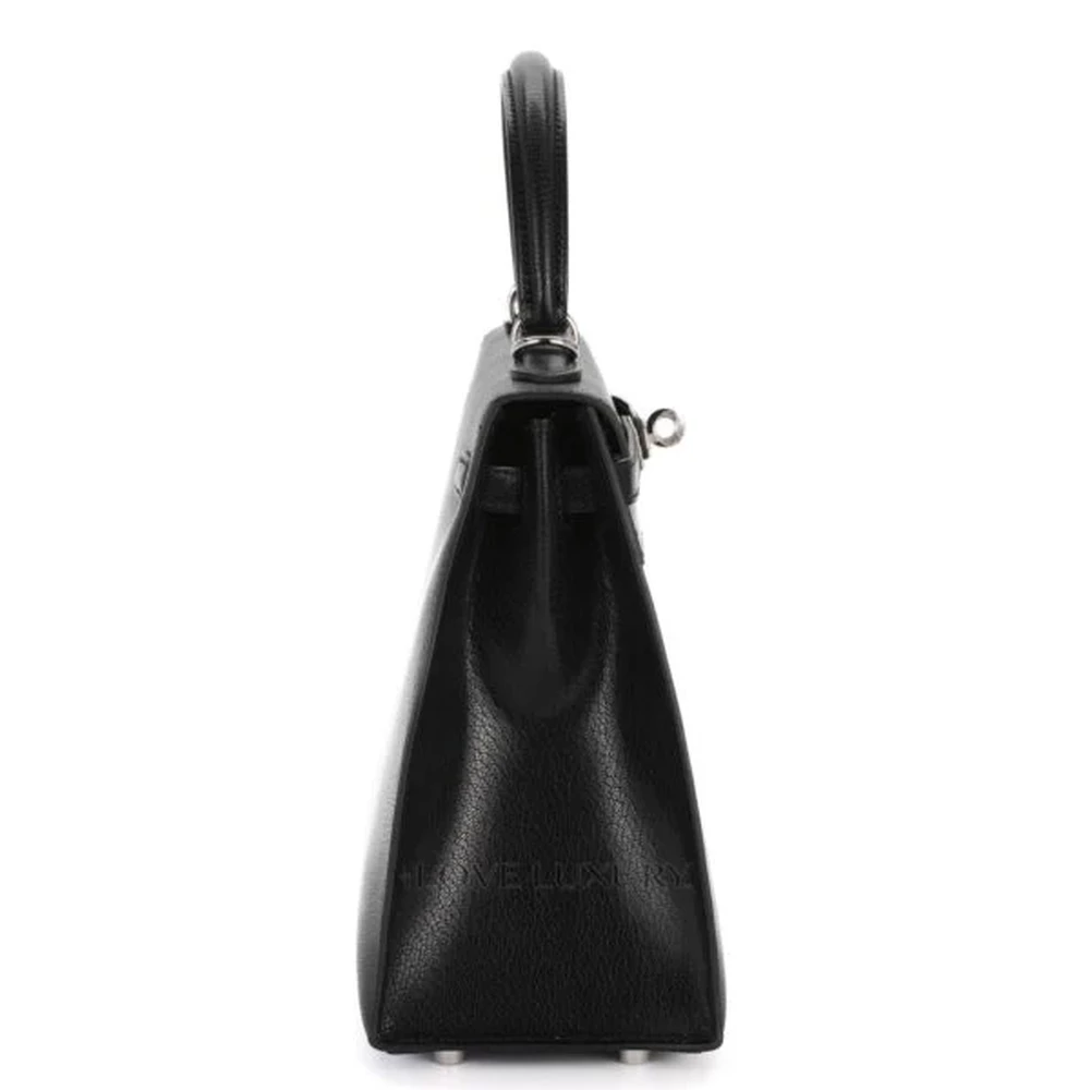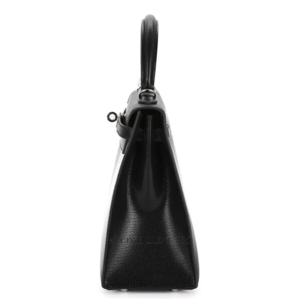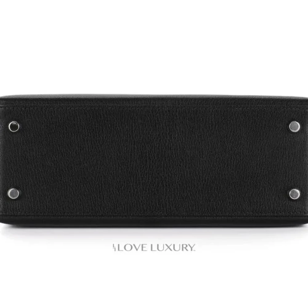 This Hermès inspired Kelly 25 features Black Chèvre Chamkila leather for glossy, edgy polish. Palladium hardware complements the sharp Sellier lines. The 25cm size fits laptops, cosmetics, and essentials. Chèvre leather stays lightweight and durable. Style with leather pants or evening wear for rebellious contrast. Built for nights out or bold office looks. Sleek audacity.