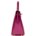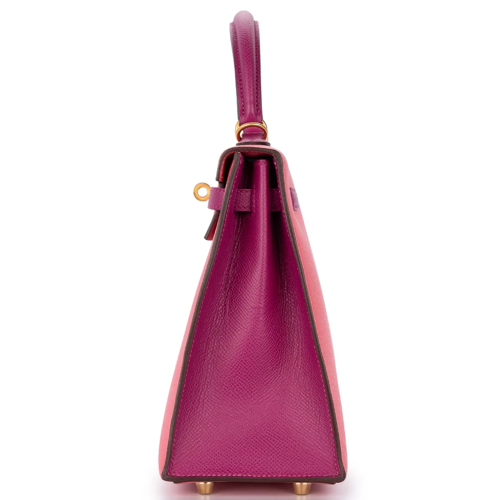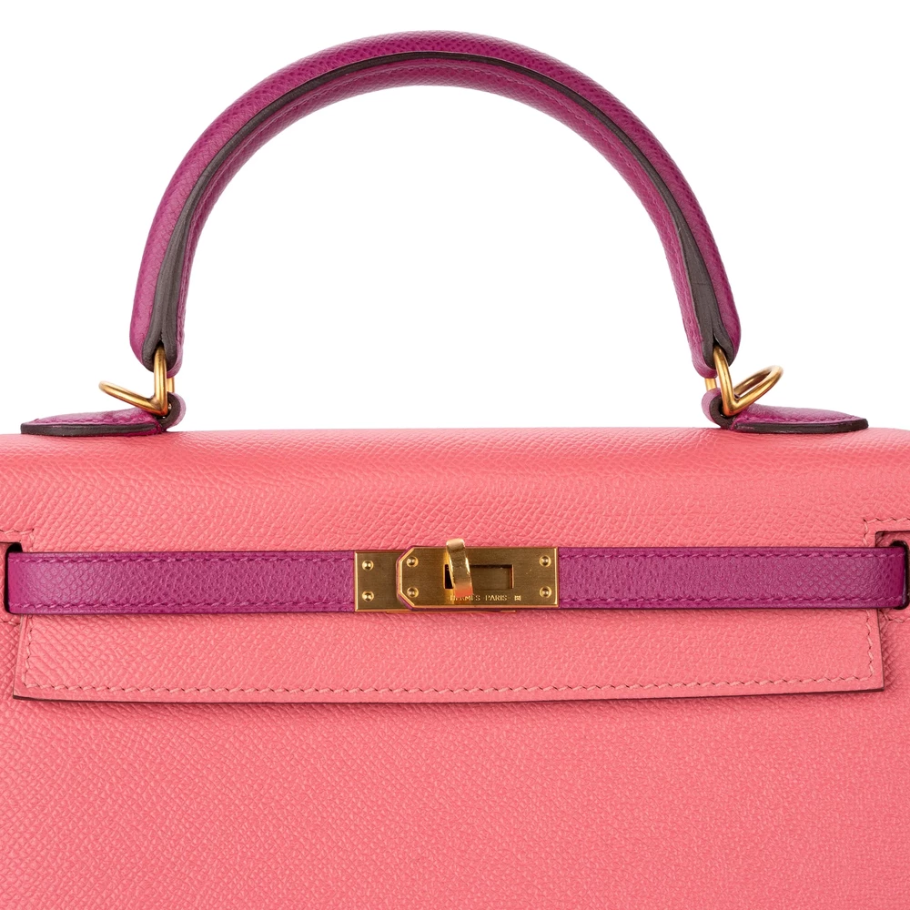 This Hermès style Kelly 25 combines Rose Azalee pink and Anemone purple Epsom leather. Brushed gold hardware adds warm contrast to the vibrant hues. The 25cm HSS design offers structured elegance for daily essentials. Scratch resistant Epsom maintains its polished finish. Pair with neutrals to let the dual tone colors shine. Perfect for spring weddings or art gallery events. A floral masterpiece in bag form.