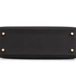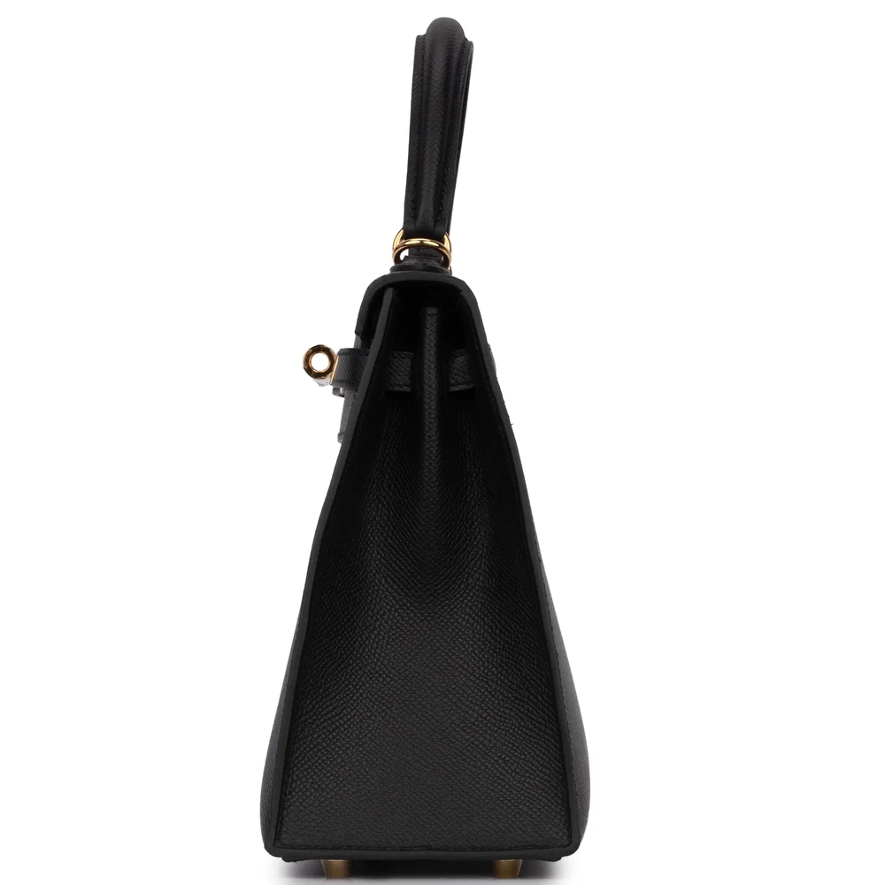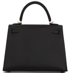 This Hermès Kelly 25 Sellier uses Noir (black) Epsom leather with sharp Sellier stitching. Gold hardware highlights the angular clasp and lines. The 25cm size fits laptops, cosmetics, and essentials. Epsom leather stays polished and durable. Style with tailored suits or evening wear. Built for power meetings or galas. Sleek authority.