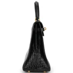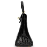 This Hermès inspired Kelly 25 features Alligator Black leather for sleek, exotic texture. Gold hardware elevates the sharp Sellier lines and clasp. The 25cm size holds phones, cosmetics, and essentials. Alligator leather resists wear and stays glossy. Pair with evening gowns or tailored suits for luxe contrast. Built for galas, dinners, or collector’s displays. Timeless opulence.